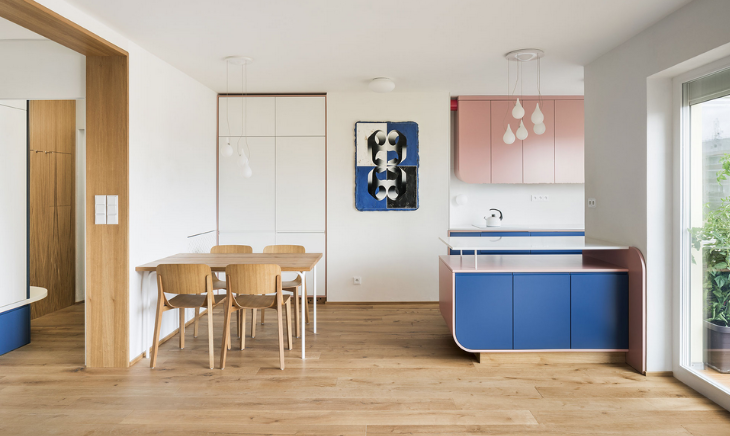 Někdo současné umění chápe jako pouhou bytovou dekoraci. Pak jsou tu sběratelé, kteří jej sice umí ocenit, ale mají své bydlení často zaskládané uměleckými díly natolik, že se z něho stává depozitář. A pak jsou lidé, kteří sice nejsou nutně sběratelé, ale přesto si pořídí jednotky kvalitních děl pro své potěšení a jsou připraveni dát jim ve svém životním prostoru důstojné místo. „Právě pro takové jsme navrhli rekonstrukci mezonetového bytu na Žižkově. Do návrhu jsme zakomponovali dvojici výrazných obrazů a současně jsme návrh zakomponovali do obrazů. Šedesát devítka vykukuje z kapotáží topení i z nábytku, ale především je zastoupena přímo v obraze Vladimíra Houdka, který má pro majitele zvláštní význam včetně právě uvedeného čísla samotného. Nezvykle divoce tvarované okraje obrazu se zas třeba propisují do zakončení dvířek od kuchyňské linky. Setkání barevnosti obrazů i interiéru mluví samo za sebe. Kromě zřejmých vztahů jsou tu i ty méně nápadné jako je odstín stěrky za knihovnou. Ten byl namíchán tak, aby souzněl se zde umístěným obrazem Josefa Bolfa. K jeho noblesní melancholii odkazují svítidla ve tvaru slz, ale třeba i umístění v ose výhledu na Vodopád na slepé stěně žižkovského paneláku od Patrika Hábla,“ popisují Jakub Filip Novák, Daniela Baráčková a Ján Šefčík z NO ARCHITECTS. Navrhli jednoduché bydlení pro mladou rodinu, která umění rozumí, umí jej ocenit a poradovat se z něj.