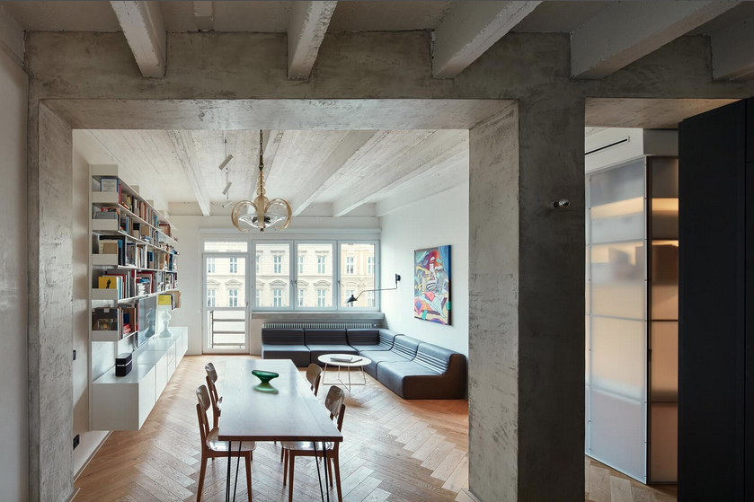 Kompletní a pečlivá rekonstrukce tohoto velkoryse řešeného bytu byla dokončena před třemi lety. Interiér ozvláštňují odhalené betonové stropy ve výšce 3,3 m, stěrky Betonepox od firmy Němec a vložené moduly s kuchyní, koupelnou a šatnami. Nábytek v šatnách, kuchyni a koupelně vyrobila na míru brněnská rodinná firma Duro Design. Kuchyně je vybavena indukční varnou deskou se spodním odtahem Elica Nikolatesla, myčkou nádobí, elektrickou a mikrovlnnou troubou Electrolux a chladničkou AEG, varný ostrůvek má povrch z umělého kamene Technistone. Novou dispozici uzpůsobenou potřebám větší rodiny tvoří obývací pokoj s otevřenou kuchyní a jídelnou, dva dětské pokoje, hlavní ložnice, pracovna, dvě šatny, koupelna, samostatná toaleta, prádelna a zádveří. Obytný prostor je navíc rozšířen o dva balkony – jeden orientovaný na východ do zeleného vnitrobloku a druhý na západ do ulice.