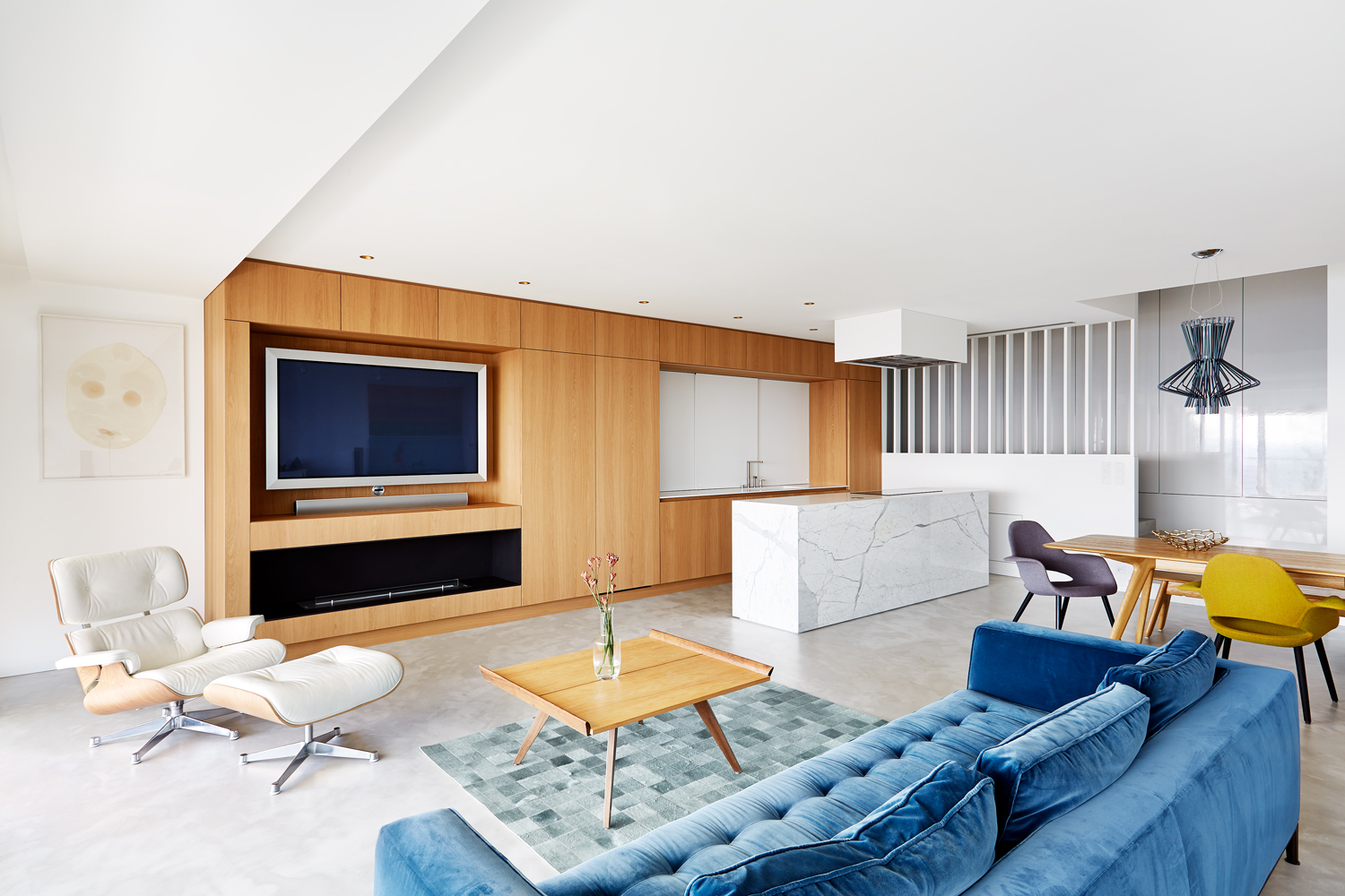 Obývací prostor zůstal otevřený a není nijak rozdělený, přičemž se dá prodloužit ještě o venkovní terasu velkými posuvnými panely. Úchvatný výhled na město jen umocňuje celý pocit z tohoto místa. V obývací části na první pohled zaujme dřevěná stěna, která je součástí „obýváku“ i kuchyně. Na jednom konci se nachází televizní výklenek, krb a ve druhé vestavěný bar a vestavěná kuchyňská linka s pracovní deskou ve výklenku. „Umístěním veškerého potřebného vybavení na jednu stranu místnosti jsme mohli ponechat protější stěnu volnou jako expozici pro obrazy. Kuchyňská část je navržena tak, že se v době nepoužívání dá schovat, takže opticky nenarušuje obývací část – dřevěná dvířka mohou zakrýt sadu spotřebičů, posuvné panely z bílého corianu mohou zavřít police za polici. stůl v otvoru. Kuchyňský ostrůvek s obkladem z carrarského mramoru vyniká v prostoru jako šperk,“ dodávají. V kuchyni je navíc úložný prostor s psacím stolem. Vstupní chodba je z části rozdělena bílými vertikálními lamelami. Všechno dohromady připomíná náladu 50. a 60. let v Americe.