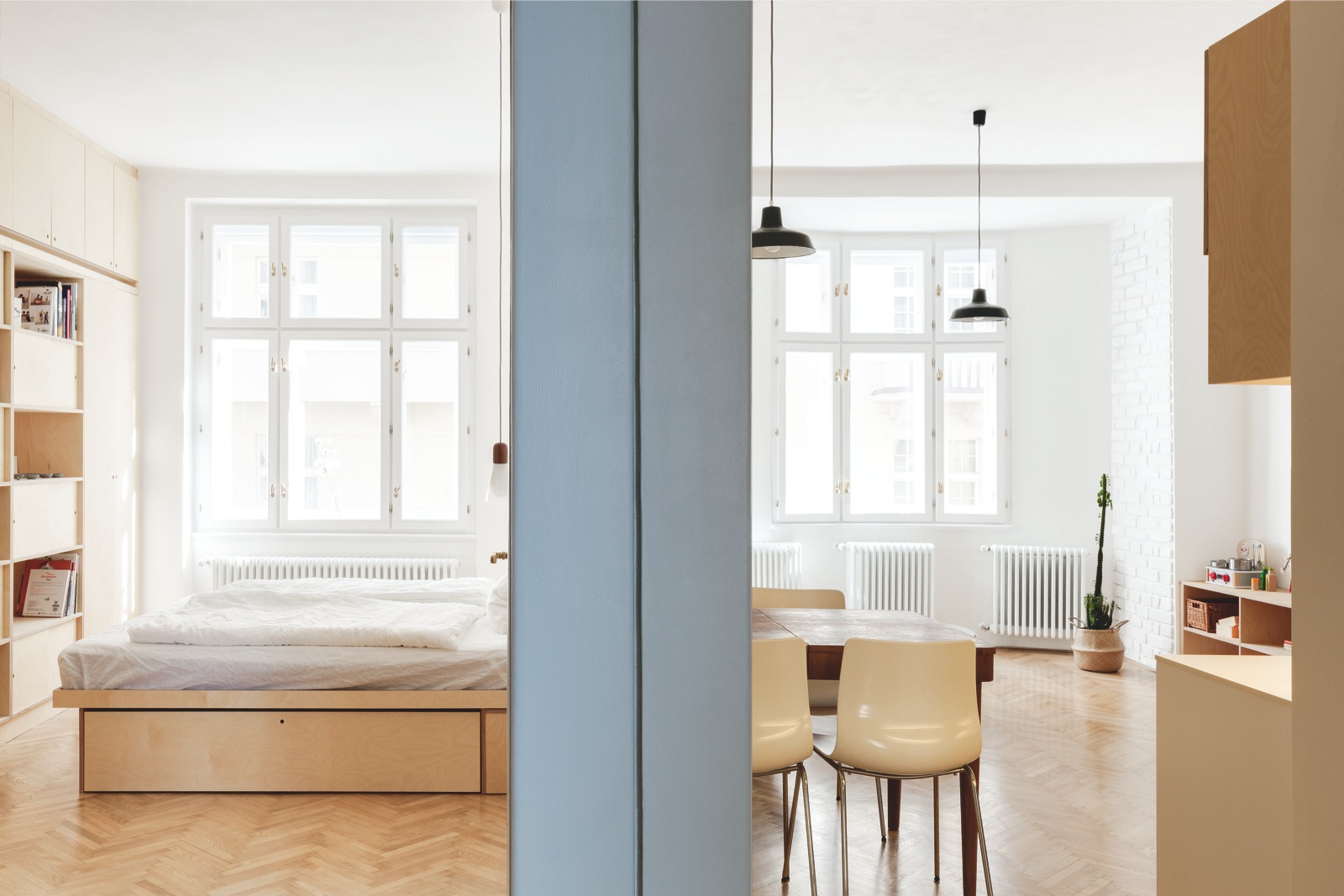 „Spolupráce se krásně vyvíjela.Začali jsme jen s návrhem skříně, jenže postupem času jsme v souznění došli až k plánu kompletního interiéru včetně změny dispozic,“ popisuje architektka Iveta Čermáková. Místo kuchyně je dnes dětský pokoj, komora na chodbě padla za oběť sprchovému koutu a dveře mezi obývákem a ložnicí řemeslníci v rámci nového plánu zazdili, čímž se v obou místnostech uvolnila jedna stěna. Minimalistický duch je tu cítit z každého koutu. Obklady v kuchyni za pracovní deskou jsou stejné jako na toaletě a v koupelně, dlažba z chodby se opakuje i na malém balkonku. „Když zařizujeme takhle krásný byt se zajímavou dispozicí, ve starém zděném domě, rádi necháváme mluvit interiér. Vysoké stropy, velkorysou halu s krásným členěným oknem přivádějícím světlo ze společné chodby… V takovém prostoru není nutné strhávat pozornost výraznými barvami nebo nábytkem,“ říká Iveta. Radost tu najdete v detailu. V jemném rýhování překližkových desek, ve hře s kulatými otvory na dvířkách nábytku nebo v čele dětské postele. „Vůbec to na mě nepůsobí monotematicky, naopak mám mnohem větší prostor dát do polic barevné knihy, na stůl výraznou kytici, rozmístit na podlaze koše na drobnosti, tím se z krásného čistého prostoru stává domov, kde má každá místnost svou velmi osobní atmosféru,“ popisuje Lucie.