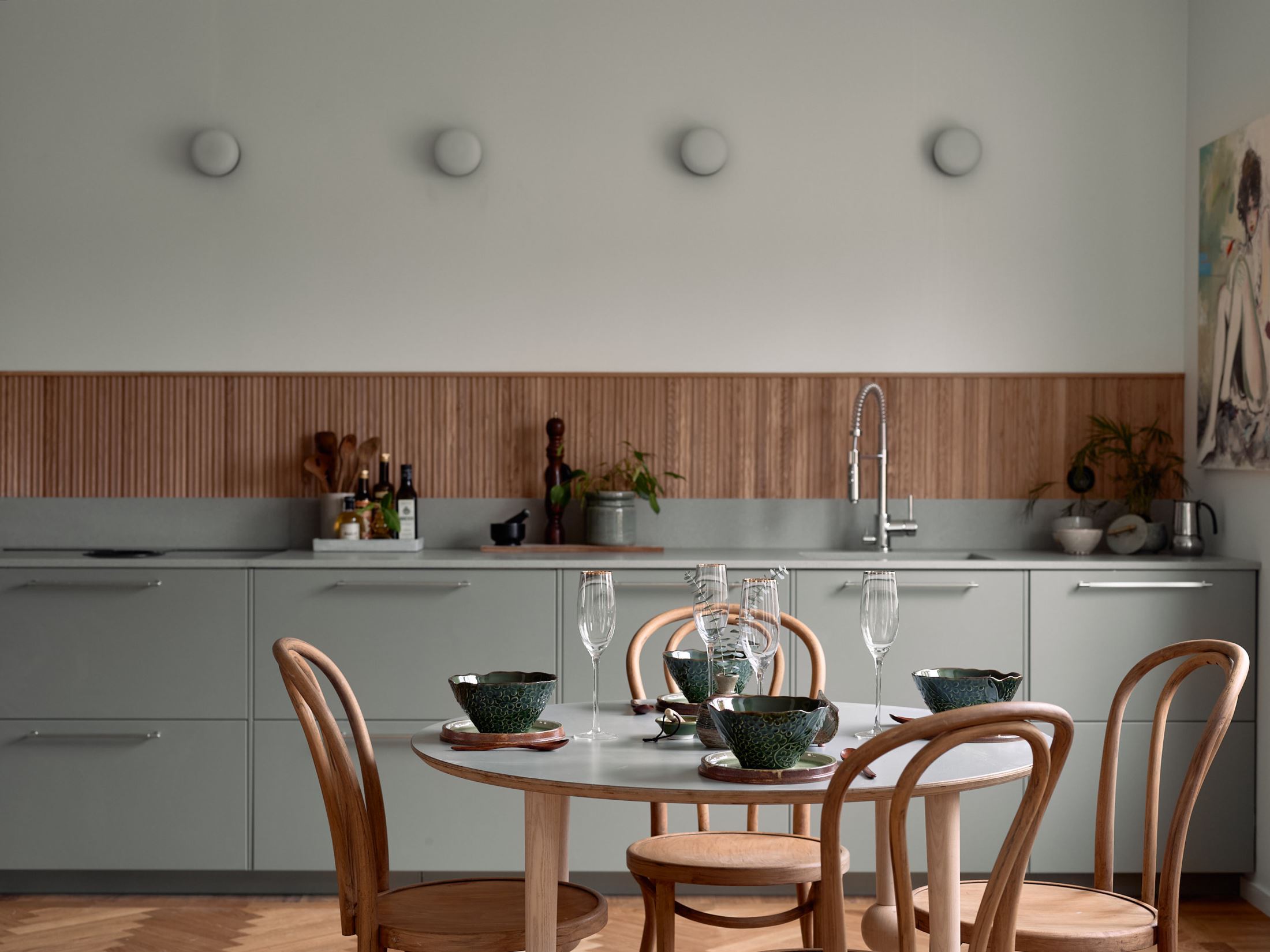 Kuchyně byla stejně jako celý byt pečlivě zrekonstruovaná. Prostor kuchyně, jídelny a obývacího pokoje je propojený, a tak museli architekti vymyslet takovou linku, aby ladila i s vybavením ostatních pokojů. Veliké úložné prostory se tak nacházejí na nepohledové zdi, zatímco na té čelní, jsou pouze nízké nenápadné šedé skříňky s dřevěným obkladem. Stejná kombinace se objevuje o kousek dál na velkém nábytkovém monolitu v obývacím pokoji, který slouží jako police i pohodlná lavice. Z kuchyně je možné vejít na menší balkon. Za obývacím pokojem je menší pracovní kout a pak soukromá ložnice rodičů s vlastní šatnou i koupelnou.