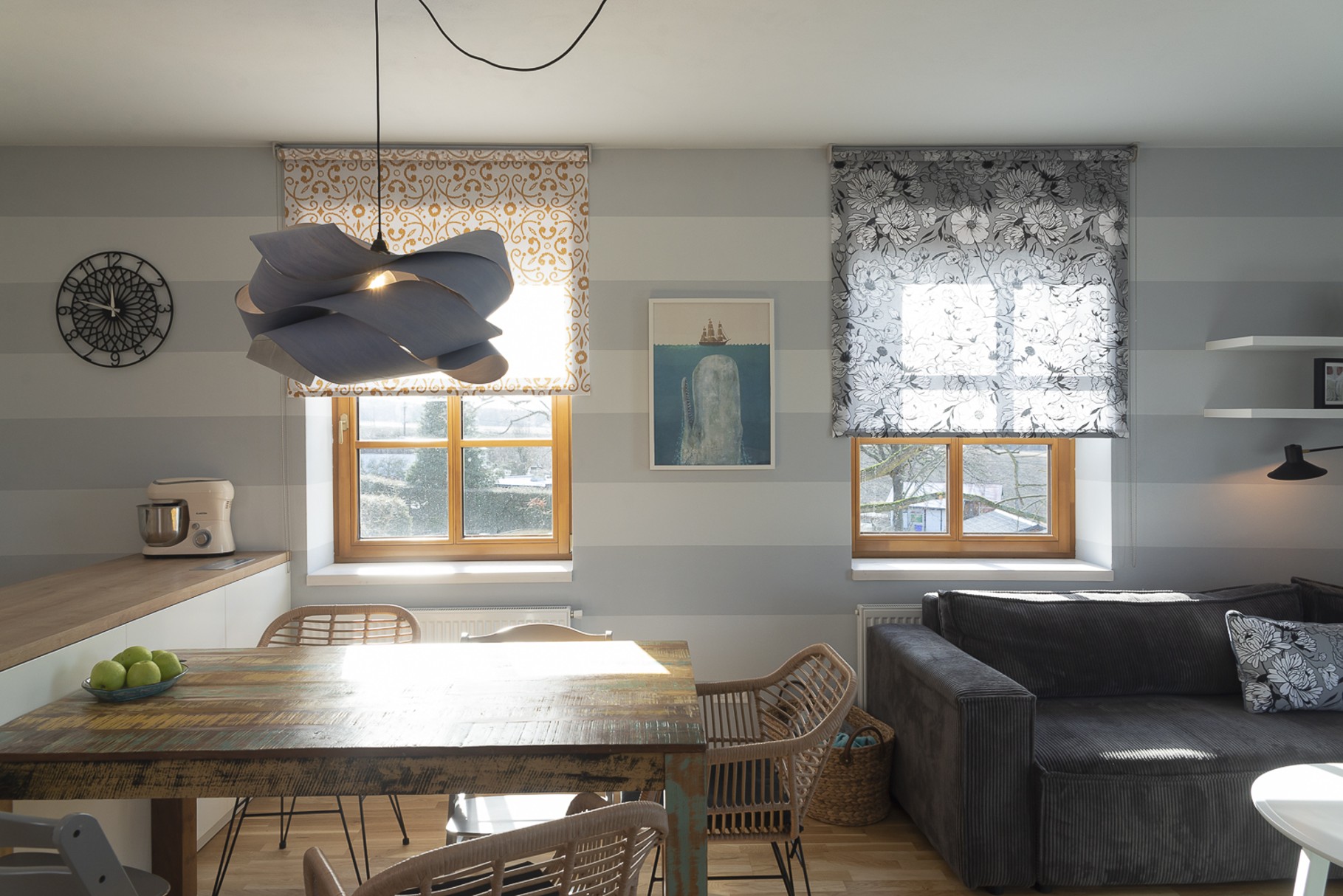 „Klientka nám nechala nám velký prostor v návrhu především textilních dekorací a nebála se kombinací dekorů, jak na textilu tak na stěnách, což je pro naší práci typické. V tomto směru jsme tedy nebyly finančně omezené, zlevnění se hledalo především ve výběru truhláře a typových nábytků,“ popisují designérky. K autorským věcem vedle maleb patří v dětském pokoji ještě veškerý textil ( závěsy sešívané z pruhů, kapsáře, polštáře, závěsný lustr). „V dětských pokojích většinou vždy navrhujeme rovnou velkou dospělou postel, v tomto interiéru si ale paní majitelka přála pro svá dvouletá dvojčata malé postýlky ve tvaru domečku.“ Majitelé si přáli zachovat jídelní stůl a černé kovové hodiny. Tyto dva prvky tedy celkovému pojetí interiéru udaly směr. Všechny prostory bytu, kromě koupelny, dekorují malované vzory. V obývacím pokoji a předsíni silné šedé pruhy, stejně tak i v ložnici, tam jsou navíc v kombinaci s motivem monumentální květiny. Dětský pokoj je dekorován v horní části stěn tenkými proužky a siluetami mraků a malovanými hodinami.