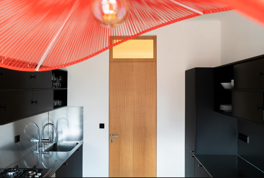 Ke koupelně se nakonec připojil i zbytek bytu. Kuchyň se stala příjemným experimentem pro mladý pár. Prostor pro jídelní stůl definují parkety, prostor pro vaření dlažba. Černá linka s kovovými posuvnými dvířky, deska z nerezu. Dvířka dělají kuchyň v pohybu. „Něco je vidět, něco ne a každý den je to trošku jinak. Zbytek bytu doplňuje zrekonstruovaná chodba s velkým kruhovým zrcadlem, skříní a stejnou dlažbou, jako v kuchyni, ale jiné barvy,“ uzavírá architektka.