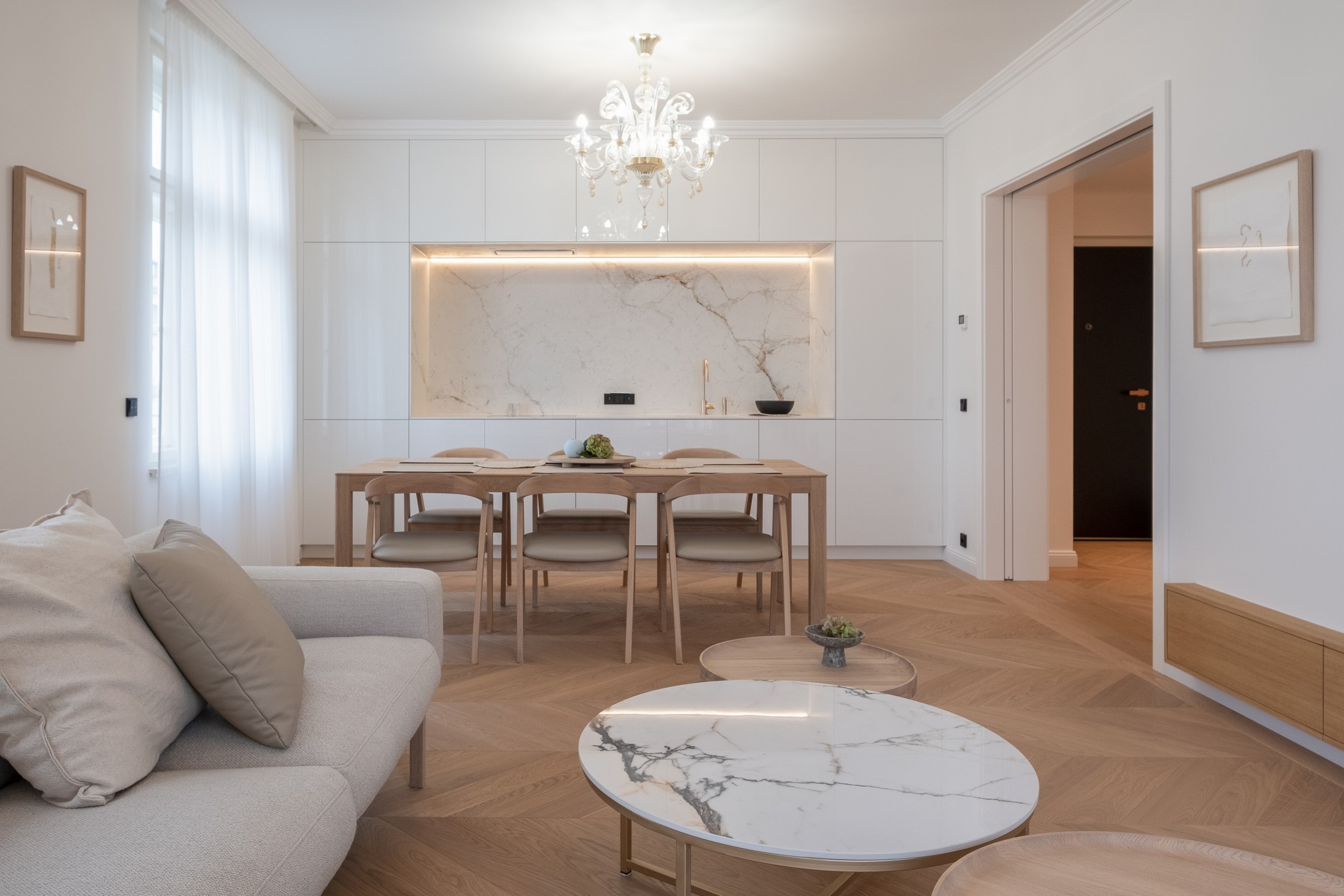 Bílé stěny a nábytek na míru vytvářejí neutrální kulisu, ve které mohou vyniknout jak původní architektonické prvky – například zdobné okenní rámy a vysoké stropy –, tak i umělecké detaily, jako jsou historické obrazy. Pudrově růžové doplňky dodávají celému interiéru jemný, ženský dotek, aniž by narušovaly jeho klidnou atmosféru. Podlahy v běleném dřevěném dekoru v chevron vzoru vnášejí do prostoru dynamiku a jemný kontrast, zatímco velká okna propouštějí dostatek přirozeného světla, které celému bytu dodává až snovou lehkost. Každý prvek byl navržen s důrazem na funkčnost i estetiku. Nábytek v bílém provedení byl vyroben na míru tak, aby přesně odpovídal proporcím místností a potřebám klientky. Výsledkem je prostor, který působí přirozeně a vyváženě, není ani strohý, ani přezdobený. Interiér v Bílé harmonii je důkazem toho, že i minimalistický přístup může vést k velmi osobitému a hřejivému výsledku. Kombinuje v sobě to nejlepší z historie i současnosti, a především nabízí obyvatelce přesně to, co hledala: klidné, elegantní a inspirativní místo pro život.