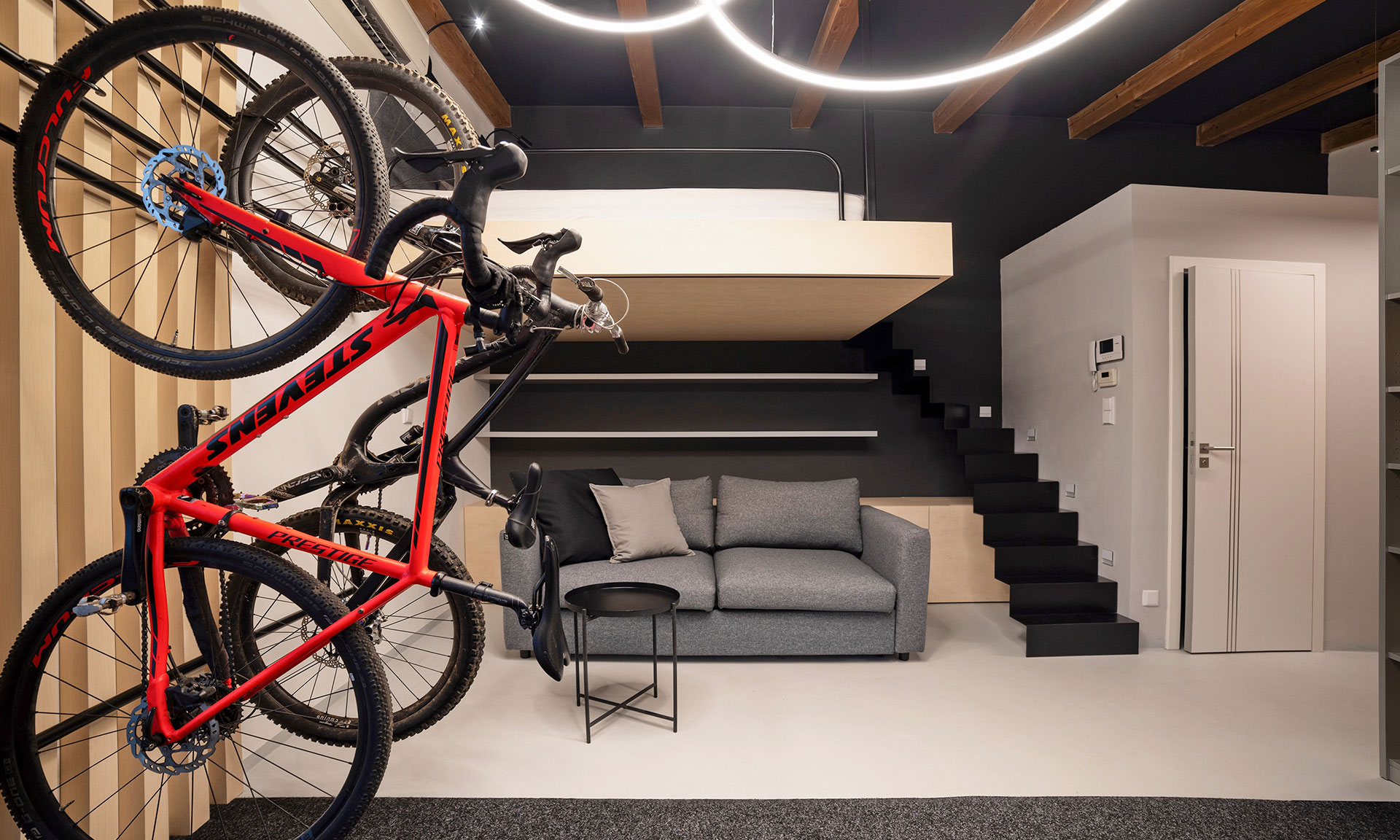 „Garsonka v zahradě rodinného domu, kterou jsme spolu s klienty nazvali „CYKLORÁJ“, představuje promyšlenou kombinaci moderního designu, funkčnosti a flexibility,“ vysvětluje autorka projektu. Původní kůlna, která dříve sloužila jako sklad, prošla kompletní rekonstrukcí a získala novou náplň – prostor pro krátkodobý pobyt čtyř osob s možností proměny na domácí wellness. „Do obytného prostoru garsonky s převýšeným stropem jsem navrhla levitující dvoulůžko, přístupné po ocelovém strmém schodišti, připomínajícím poskládanou stuhu, pod nímž je prostor pro rozkládací pohovku s parametry každodenního spánku,“ vysvětluje autorka projektu Ing. arch. Zuzana Uhlířová. Design interiéru vychází z čistých a nadčasových linií, kombinace stříbřitě šedé a bílé s jemným dřevem javoru, doplněné akcentní černou barvou, která dodává prostoru hloubku a divadelní atmosféru. Úložné prostory, chytře schovaná televize a lamelová stěna pro kola zajišťují, že je garsonka praktická i pro každodenní užívání.