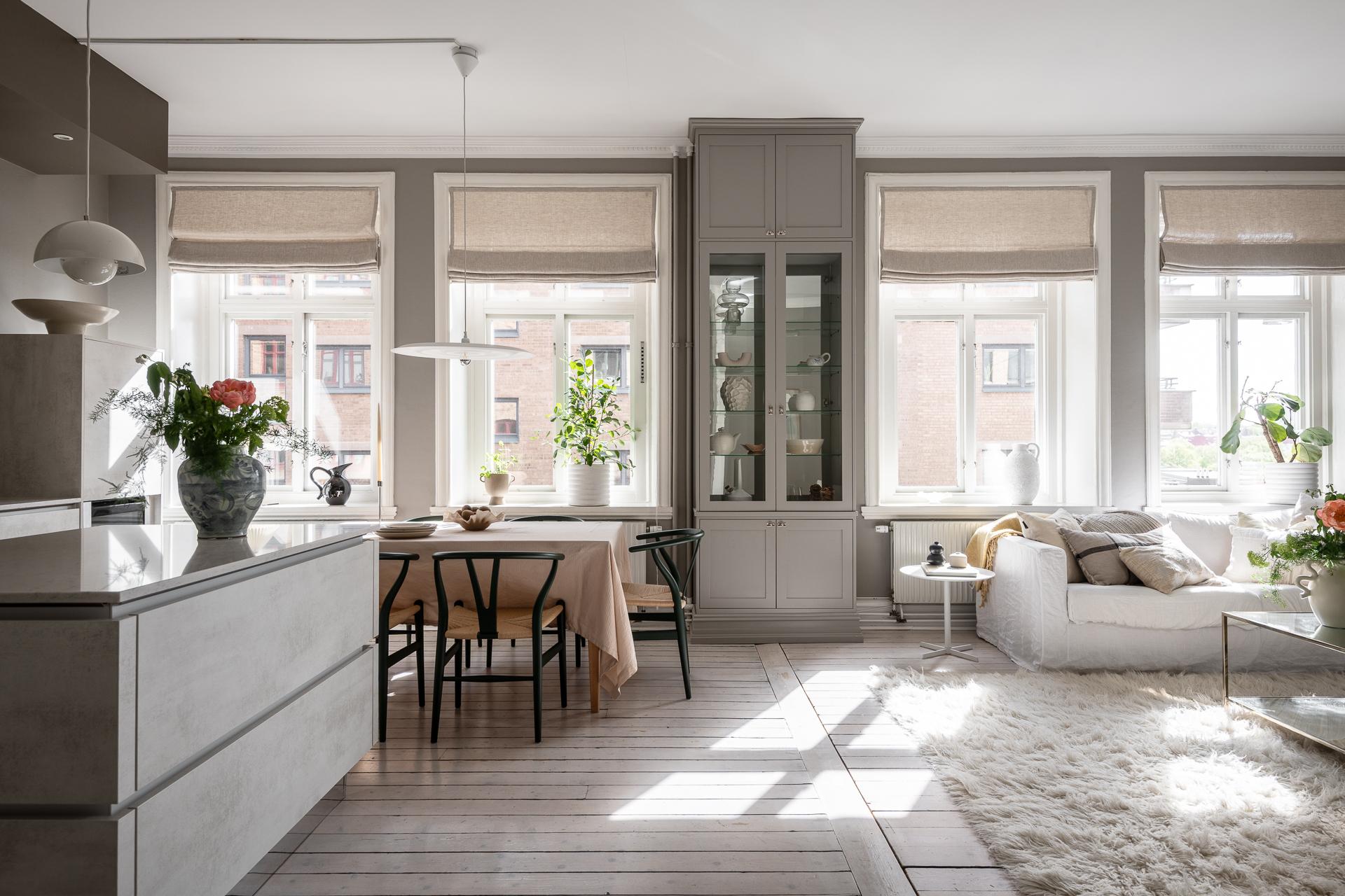 Ve chvíli, kdy procházíte monumentálním vstupem do domu na Kungshöjdsgatan 11A, máte pocit, že jste se ocitli někde mezi minulostí a současností. Interiér, do kterého vstupujeme, kombinuje klasický základ s pečlivě zachovanými historickými prvky: vysoké stropy zdobené štukaturami, velká okna s hlubokými parapety a kvalitní dřevěné podlahy v přírodních tónech. Dominantou bytu je otevřený obývací prostor s kuchyní, kde čisté linie betonu a světlého dřeva dokonale ladí s béžovými stěnami. Veškeré moderní technologie - od osvětlení po audio systém - jsou integrované tak nenápadně, že nenarušují celkový dojem klidné, téměř zenové atmosféry. Byt je prostorný, ale zároveň útulný, a působí dojmem dokonale vyváženého prostoru, který zve k odpočinku i společenskému setkávání.