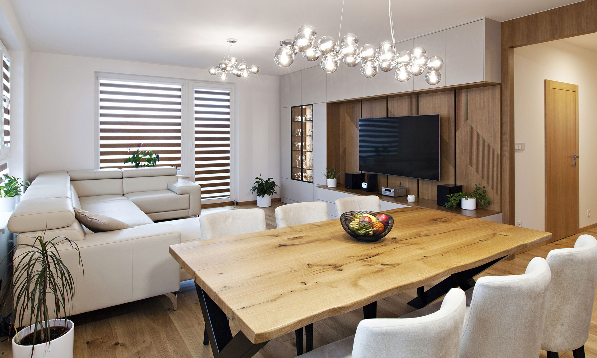 Zásadní roli v interiéru hrají přírodní a trvanlivé materiály, především dubové dřevo v několika odstínech a formách – od masivu až po dýhu. Velkou výzvou bylo sjednotit jejich barevnost do harmonického celku, který nepůsobí monotónně, ale zároveň neruší. Dřevo doplňuje minimalistická béžová paleta a měkký haptický efekt přináší textilní čalounění, netradičně použité i na křídlech šatní skříně v hlavní ložnici. Mezi specifické prvky realizace patří celoplošná bezprahová masivní podlaha, nestandardně vysoké postele navržené na přání klientů, dýhované frézované obklady v chodbě nebo předpříprava na infrasaunu v koupelně. Veškerý nábytek, čalounění i stavební práce vznikaly ve spolupráci s lokálními řemeslníky, což podtrhuje udržitelný charakter projektu. Výsledkem je klidný, adaptabilní a dlouhodobě funkční domov, který reaguje na proměny života svých obyvatel a obstojí i s odstupem času.