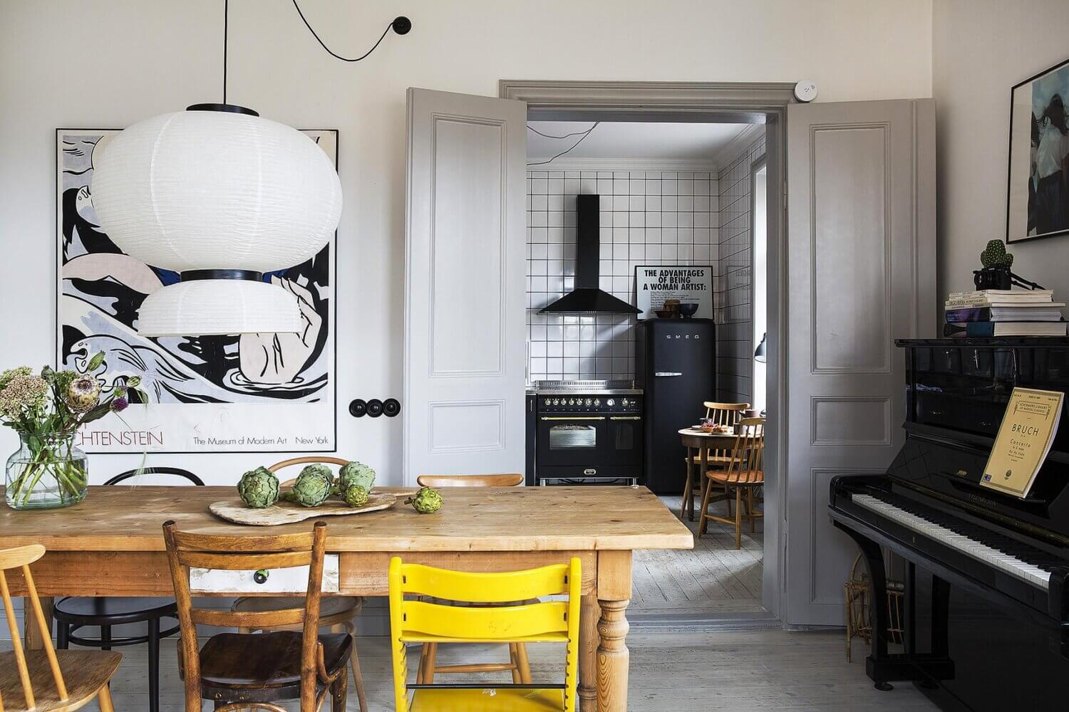 Tento byt v jednom z nejživějších stockholmských čtvrtí je ukázkou toho, jak lze kombinovat historickou architekturu s moderní industriální estetikou. Zrekonstruovaný v roce 2016, prostor si zachovává původní secesní prvky – vysoké stropy, detaily štukových lišt a velká okna, která dodávají místnostem vzdušnost a eleganci. Současně jsou zde patrné industriální zásahy: ocelová okna a dveře, nerezová kuchyň a minimalistické kovové prvky, které prostor doplňují moderním a lehce „tvrdším“ charakterem. Byt nabízí tři ložnice, z nichž každá disponuje velkými industriálně rámovanými okny, která zajišťují přirozené světlo po celý den. Jeden z pokojů je zároveň atelierem, což naznačuje, že zde žije kreativní osobnost. Stěny jsou pokryté originálními obrazy a kresbami, takže každý kout bytu působí jako součást galerie. Otevřený obývací prostor s kuchyní je propojen s jídelním koutem, což umožňuje pohodlné a inspirativní setkávání, zatímco soukromí jednotlivých pokojů zůstává zachováno.