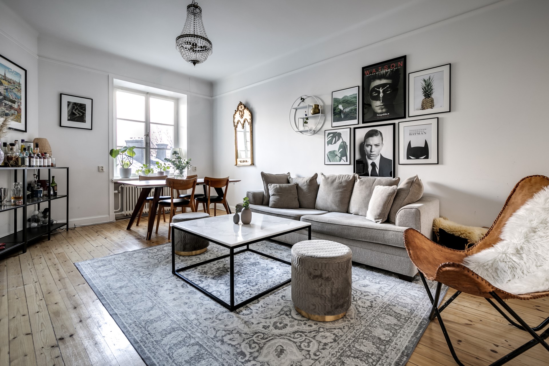 Když vejdete do bytu, ocitnete se v menší předsíni s odkládacím nábytkem, je tu malá komora a vedou odtud dveře do haly, která je sama o sobě reprezentativní a propojuje obě části bytu. Je tu praktická komoda, a především veliké secesní zrcadlo. V celém interiéru jsou dřevěné dubové parkety. Na jedné straně bytu je moderní kuchyň v bílém dekoru. Linka je postavená truhlářem na míru. Skříňky má až ke stropu a je po obou stranách místnosti, takže je úložný prostor skutečně velkorysý. Pod oknem je malá lavice k posezení s kávou, ale větší jídelní stůl našel své místo v obývacím pokoji. Vedle kuchyně je ložnice. Ani ta není ochuzená o úložný prostor. Celou jednu stěnu zaujímá veliká šatní skříň. Z ložnice vedou dvoukřídlé dveře na balkón orientovaný na jižní stranu a situovaný do klidného vnitrobloku. Obývací pokoj je na opačné straně bytu s oknem vedoucím do ulice. Pod ním je jídelní stůl a nechybí pohodlná sedačka doplněná o praktické sedací pufy.