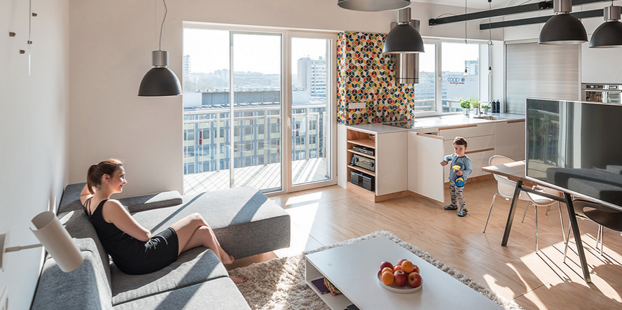 Interiér třípokojového podkroví byl navržen tak, aby zdůraznil hlavní výhody loftů - jednoduchost, ležérnost a prostornost. Viditelné prvky ocelové konstrukce střechy dodávají podkroví průmyslový charakter, zatímco přírodní materiály ho útulně doplňují. „Navzdory trendové denní oblasti je uspořádání podkroví určené pro čtyřčlennou rodinu racionální a praktické. Denní zóna se skládá z haly, kuchyně, jídelny a obývacího pokoje. Noční zóna má dvě ložnice, koupelnu a samostatné WC,“ prozrazují autoři projektu ze studia RULES architects. Bratislavský byt má obytnou plochu 95 m². Navzdory průmyslovým prvkům je obývací pokoj v podkroví útulný. Nevzhledné prvky jako je stereo systém nebo počítač jsou schované ve skříňkách. Osvědčená kombinace dřeva s černou a bílou funguje kdykoli a kdekoli. Prvky, které jsou v přímém kontaktu s návštěvníkem – podlaha a zeď naproti oknu – byly navrženy z teplého borovicového dřeva. Stěny, strop a nábytek jsou bílé. V neutrálním prostoru je pozoruhodná černá střešní konstrukce.