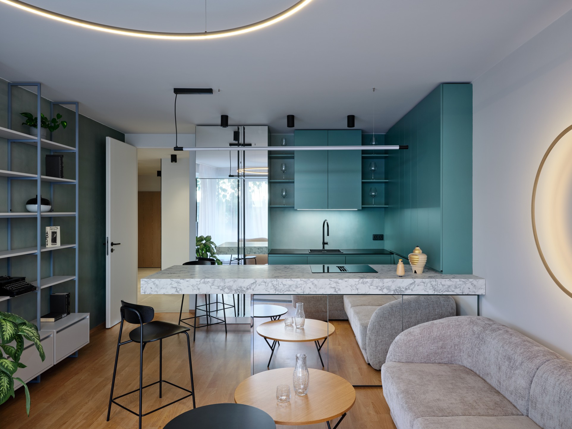 V obytném prostoru zaujme nejen epoxidová stěrka ladící s kuchyní, ale také subtilní ocelová knihovna, čtecí koutek a elegantní zrcadlové skříňky. Koupelna, kterou od chodby odděluje prosklená příčka v jemném tónu, působí prostorněji a zároveň příjemně propojuje jednotlivé části bytu. „Chtěli jsme dosáhnout maximální funkčnosti, ale bez kompromisů v estetice. Byt je malý, ale každý centimetr má své opodstatnění,“ dodává Varsová. Projekt tak představuje inspirativní příklad dostupného, zároveň však nadstandardního bydlení, kde se potkává design, účelnost i osobní styl.