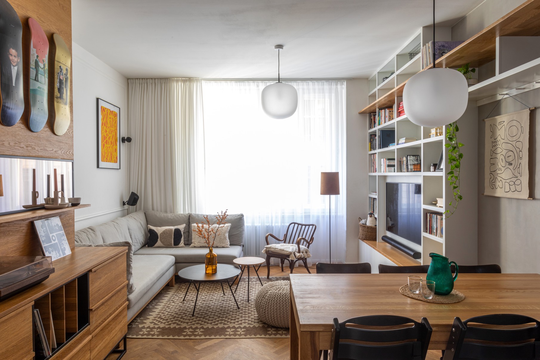 Postavení nových příček v chodbě umožnilo v herně vytvořit kout se zvýšeným patrem, pod nímž jsou šatní skříně a čtecí koutek, na tento kout pak navazuje lezecká stěna a je zde i houpačka. V ložnici zatím rodiče spí s malými dvojčaty, proto k manželskému lůžku přibyla ještě jedna postel a vejde se sem celá rodina. Byt je pomyslně rozdělen na dvě křídla: vpravo od vstupních dveřích začíná barevnější dětská část, do které uvádí z chodby výrazná stěna, inspirovaná výtvarným uměním, ke kterému má rodina velmi blízko. Levá, dospělá, část bytu má mírně industriální a nekonvenční vzhled díky posuvným dveřím do kuchyně a díky stěně v obývacím pokoji, kde jsou vystaveny skateboardy hlavy rodiny. Na přání otce je v této části bytu rozvedena soustava reproduktorů pro poslech hudby: u sedačky, nad jídelním stolem a v koupelně. S ohledem na finance jsme použili levnější laminát při výrobě nábytku na míru, stejně jako starší vybavení z předchozího bydlení. Dražší dubové dýhy jsou použity na solitérních kusech nábytku – např. v obývacím pokoji na komodě pro gramofon. Dubové parkety odkazují na stáří domu a stěrka a kovové konstrukce vnáší do interiéru neokázalý vzhled. Byt je vizitkou jeho nekonvenčních a kreativních obyvatel.