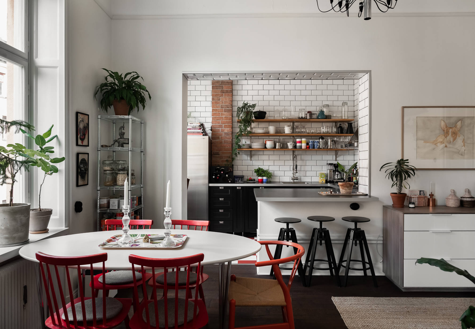 Byt sice prošel radikální rekonstrukcí, to nejdůležitější se ale podařilo zachovat. Více než třímetrové stropy, veliká okna a původní dveře jasně naznačují, že se nacházíme v secesním domě s bohatou historií. Zařízení bytu tento fakt sice respektuje, ale vydává se moderním směrem. Obývací pokoj je srdcem bytu s pohodlnou sedačkou, prostorným jídelním stolem a barem, který ho propojuje s kuchyní. Kuchyně je snad tím nejzajímavějším místem v celém bytu. Je zařízená takřka v industriálním stylu. Bílý obklad stěn kontrastuje s tmavými skříňkami a nerezovou pracovní plochou. Nerezové spotřebiče industriální dojem jenom podtrhují. Dostatek úložného prostoru dělá z kuchyně místo, kde bude každý milovník vaření rád trávit čas. Ložnice se nese v minimalistickém skandinávském stylu, kde je na jedné straně velká postel a celá stěna naproti pod oknem je zařízená jako pracovna s praktickým stolem, skříňkami a policemi. K bytu náleží ještě prostorná šatna, která by šla v budoucnu snadno přestavět na útulný dětský pokojík.