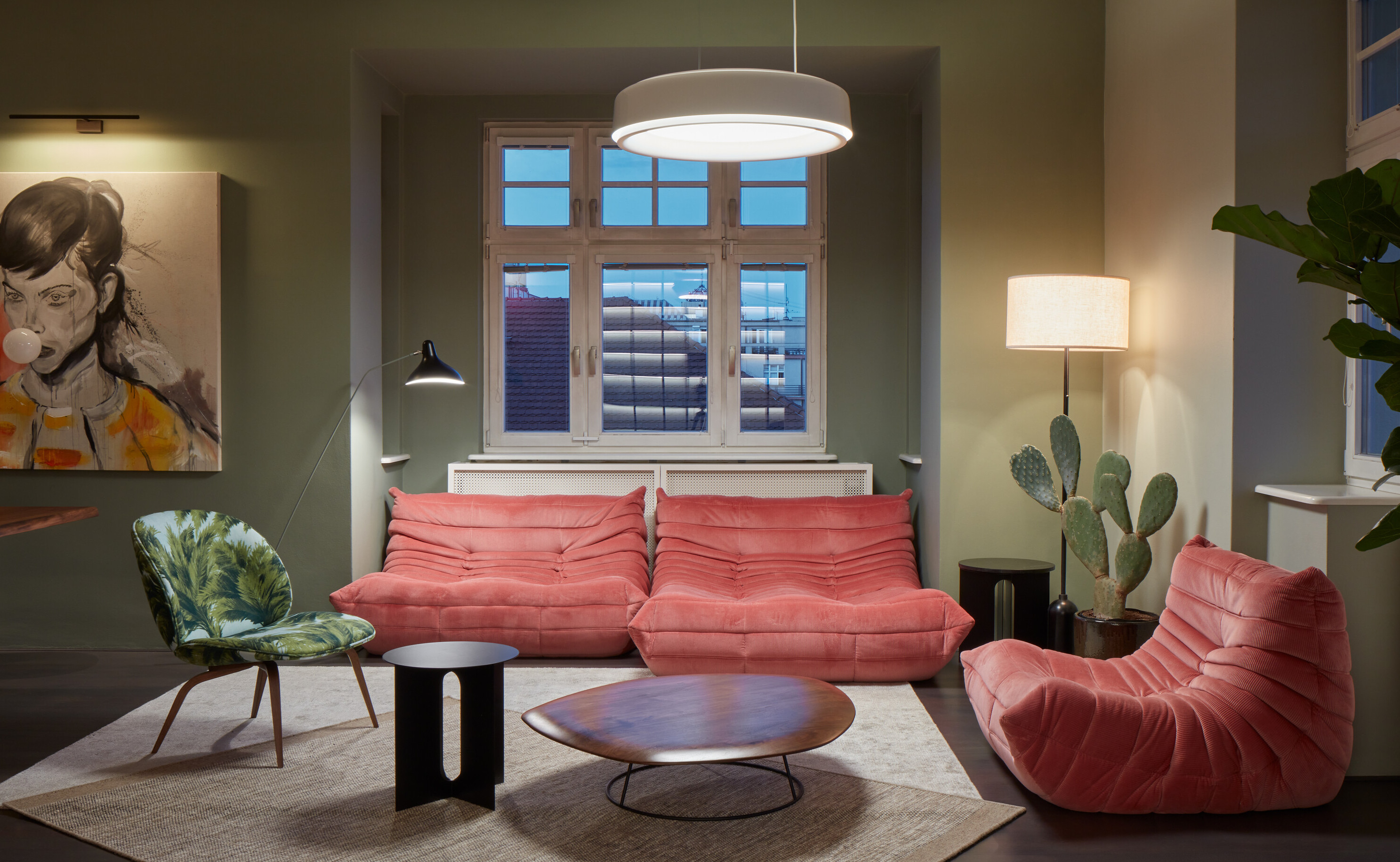 Architektky Dagmar Štěpánová a Dana Szabó ze studia Formafatal dostaly za úkol proměnit byt na pražských Vinohradech v elegantní a hravě eklektický interiér. Zachování či repase původních historických prvků dodává interiéru noblesu, kterou ještě podtrhuje výběr kvalitního současného designu. „Majitelé bytu měli ve své sbírce umělecká díla, obrazy od Martina Krajce a Tadeáše Kotrby, která se stala vodítkem pro výběr barevnosti celého bytu a vybavení. Zvolená barevnost interiéru podtrhuje a zvýrazňuje tato umělecká díla, barvy z obrazů se postupně rozpouštějí v interiéru a jsou doplněny o další kvalitní materiály, jako např. ořechové dřevo, mramor či onyx,“ popisují autorky projektu. „Dalším z požadavků majitelů byla funkčnost, pohodlnost a praktičnost interiéru, vysoká kvalita provedení všech stavebních úprav i na míru vyrobeného mobiliáře, nebo dostatek úložných prostor. Vedle toho záliba v kvalitní současný design a přání zachování lehkosti celého prostoru.“