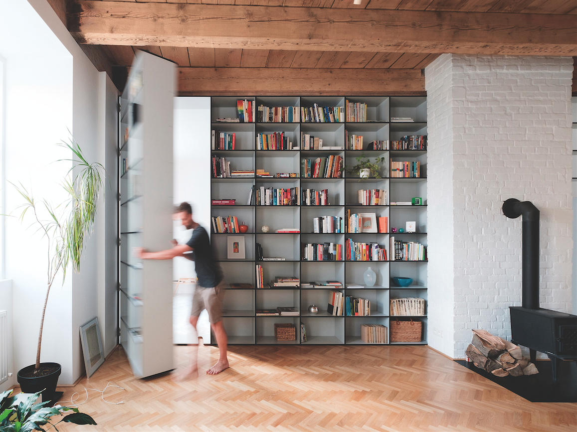 Strop pod vrstvami sádrokartonu odhalil masivní dřevěné trámoví, jemné úpravy dispozic eliminovaly hluchá místa chodeb a hlavní prostor rozšířily na maximum. Dnes mu tak kraluje velkorysý obývák s krbovými kamny, prostorná kuchyň, pohodlný jídelní kout a jedinečné řešení na míru. Jaké? Projděte skrz tajné dveře v knihovně a objevte ho s námi!