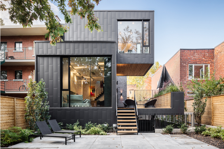 Projekt renovace a přístavby na ulici Alexandre-de-Sève ve čtvrti Ville-Marie v Montrealu v sobě snoubí úctu k tradici v kombinaci s moderním designem. „Starý objekt z 19. století jsme transformovali na bydlení se dvěma bytovými jednotkami. V přední staré části jsou dva nájemní byty o dispozicích 4 KK a 3 KK. Moderní přístavba v zadní části poskytuje bydlení pro jednu rodinu koncipované ve třech patrech,“ vyvětluje architekt Guillaume Levesque. Opravena byla také fasáda staré budovy vedoucí do ulice. Zeď byla pokryta cihlovým obkladem v tmavém odstínu, na tu navazuje břidlicová mansarda.