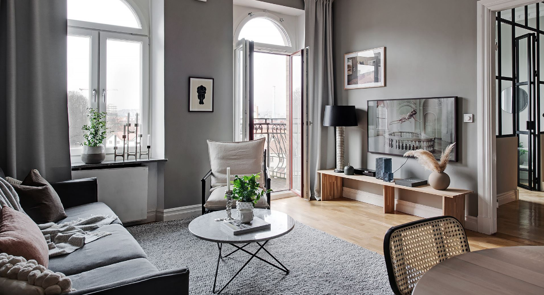 Zrekonstruovaný byt ve staré zástavbě se může pochlubit hned několika kouzelnými prvky. Jsou to dva balkonky, z nichž jeden vede na západ, druhý na východ. Oba nabízí výhledy na okolní město Göteborg. Byt je dvoupokojový s jedním extra pokojíčkem, který najdete za kuchyní schovaný za skleněnou stěnou s kovovým rámem. Může sloužit jako pokoj pro hosty, ale díky spoustě denního světla je to ideální místo pro lenošení s knížkou. Hlavní obytný prostor tvoří obývací pokoj spojený s kuchyní. Obě místnosti jsou zařízené v elegantním minimalistickém skandinávském stylu. Ani kuchyně není výjimkou. Linka od společnosti Kvänum s velkým kuchyňským ostrůvkem je navržená tak, aby spíš než pracovní kout připomínala nábytkový luxusní kus. A to se skutečně podařilo. Dřevěné skříňky doplňují nerezové prvky, a především obklad z tmavé žuly. Tmavé akcenty propojují prostor kuchyně s tím obývacím. Také zde se objevuje jak dekor dřeva, tak černé detaily. Z obývacího pokoje můžete vejít na praktický balkon. V pokoji nechybí pohodlné posezení a také jídelní stůl.
