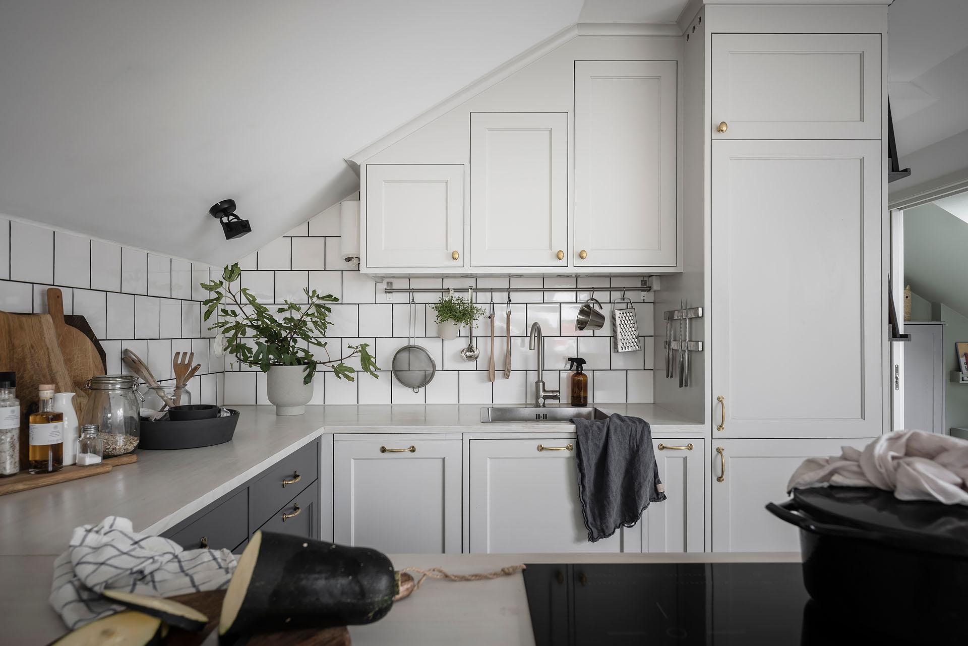 Podkrovní byt v domě ze 30. let překvapí nejen svou promyšlenou dispozicí, ale především atmosférou, která v sobě kombinuje nostalgii starých časů s vytříbeným moderním vkusem. Hned po vstupu nás vítá čistě řešená hala s kontrastem bílé a tmavě šedé výmalby, kde vynikají krásně ošetřené prkenné podlahy, které jsou v celém interiéru. Z haly se vstupuje do otevřeného obytného prostoru, v němž se propojuje kuchyň s obývacím pokojem. Jihozápadní orientace a velká střešní okna spolu s balkonovými dveřmi zajišťují celodenní přísun denního světla. Přiznané stropní trámy, otevřený strop až do krovu a pohled na nebe umocňují pocit svobody a klidu. Kuchyňskou linku v kombinaci bílé a jemně šedé s mosaznými úchyty doplňuje elegantní bílý obklad a dubová pracovní deska. Obývací zóna navazuje plynule na kuchyň a nabízí dostatek prostoru pro pohodlnou sedačku i velký jídelní stůl. Vše je navržené s důrazem na detail a přirozenou funkčnost, přičemž dominantním prvkem zůstává světlo - to proniká skrze střešní okna i přes balkon orientovaný na severozápad, odkud je nádherný výhled do zeleného vnitrobloku. Interiér působí celistvě, protože materiály i barvy se nesou v jednotném tónu.
