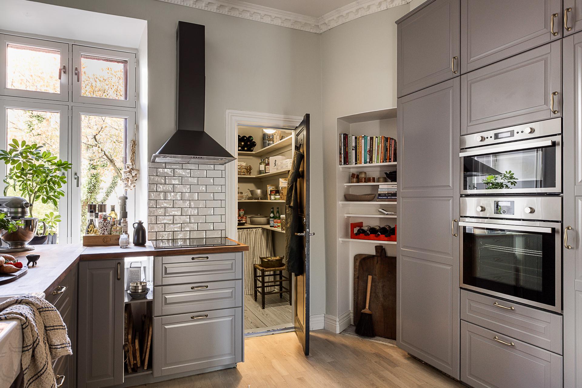 Kuchyň si zachovala půvab tradičního severského stylu - šedé profilované dvířka, bílé retro obklady a pracovní deska z tmavého dřeva působí elegantně, ale domácky. Majitelé zde přidali praktické spíže a otevřené police, které doplňují jemné mosazné úchyty a svítidla s patinou. Koupelna je moderní a přehledná, s bílým obkladem, kontrastní šedou dlažbou a černou komodou s umyvadlem. Každý kout bytu prozrazuje, že renovace nebyla o trendech, ale o respektu k původnímu duchu domu. Původní podlahy, dřevěná okna, štuky i dveře dostaly novou energii, aniž by ztratily svou historii. Přidanou hodnotou je i velká zelená vnitřní zahrada, kde se potkávají sousedé, hraje pétanque a voní grilované večeře. Byt tak není jen krásným interiérem, ale i živým domovem - místem, kde se propojuje minulost s přítomností a kde i uprostřed města vládne klid.