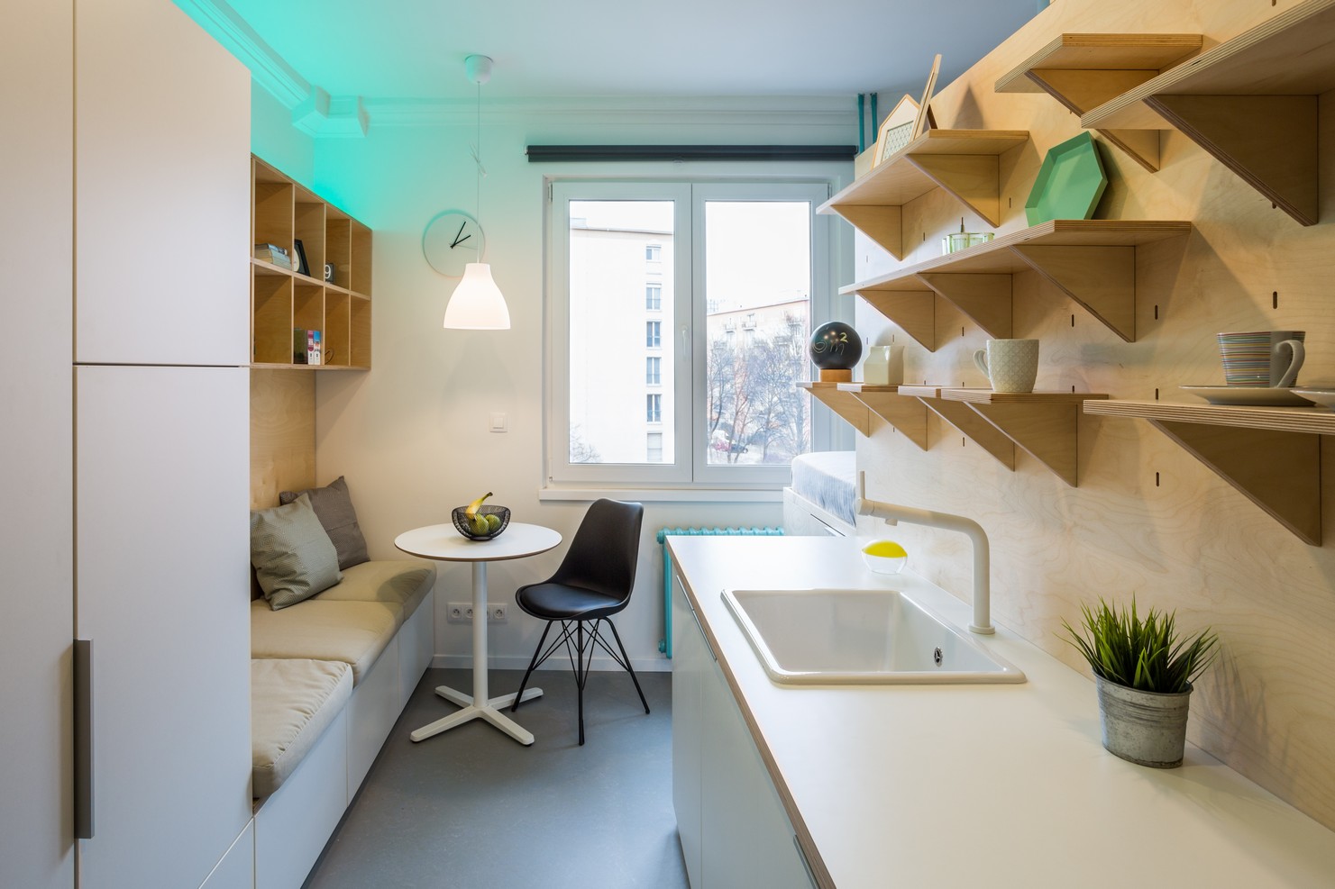 Postel je výklopná a stojí na vyvýšené plošině, čímž je dosaženo dalšího snadno přístupného úložného prostoru. Koupelna byla oproti původní koupelně zvětšena, i když bylo nutné vytvořit nestandardní sprchový kout. Barevné ladění bytu je světlé s drobnými barevnými akcenty. Stěna se vstupními dveřmi je natřena křídovou barvou na psaní poznámek a vzkazů. V bytě převládá bílá barva v kombinaci se světlou překližkou. V hygieně je použit lakobel (lakované sklo) a zrcadlový povrch zvětšuje malý prostor.