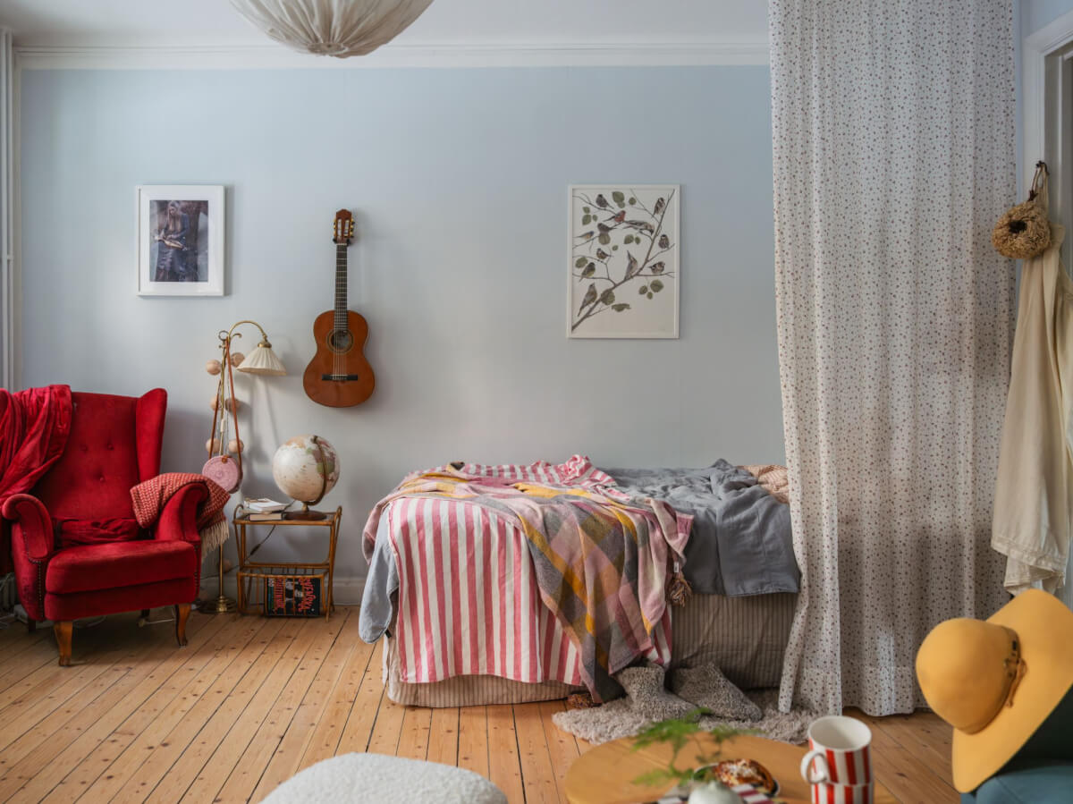 V historickém domě z 20. let se nachází kouzelný ateliér, který je důkazem, že i garsonka může působit prostorně a vzdušně. Díky rohové poloze má hlavní místnost okna na jihovýchod i jihozápad, což zajišťuje maximum denního světla po celý den. Interiér působí díky světlomodrým stěnám a voskovaným prknům teplým a útulným dojmem, přičemž originální prvky jako lišty, zdobné zárubně a hluboké parapety pod okny dodávají prostoru noblesu. Hlavní pokoj nabízí překvapivě velkorysý prostor – kromě pohodlného sezení se sem vejde i pracovní kout a dvojlůžko, které majitelka elegantně oddělila bílým závěsem. Právě tato jednoduchá, ale funkční zóna dělí místnost tak, aby působila příjemně a nepřeplněně.