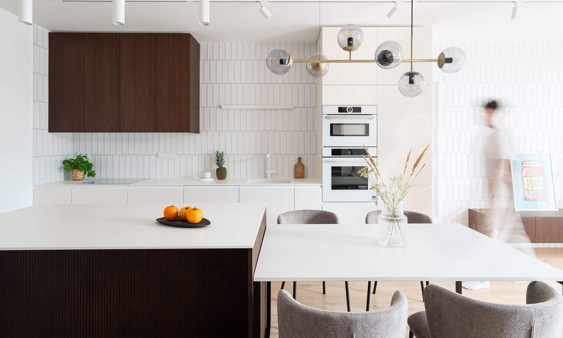 Důmyslná kuchyně, otevřený obytný prostor, keramický „pás“ přes celou stěnu a atmosféra, která vybízí k bydlení. Interiér bytu navržený pro proměnlivé potřeby ukazuje, že funkční a krásný domov může mít i nájemní adresa.