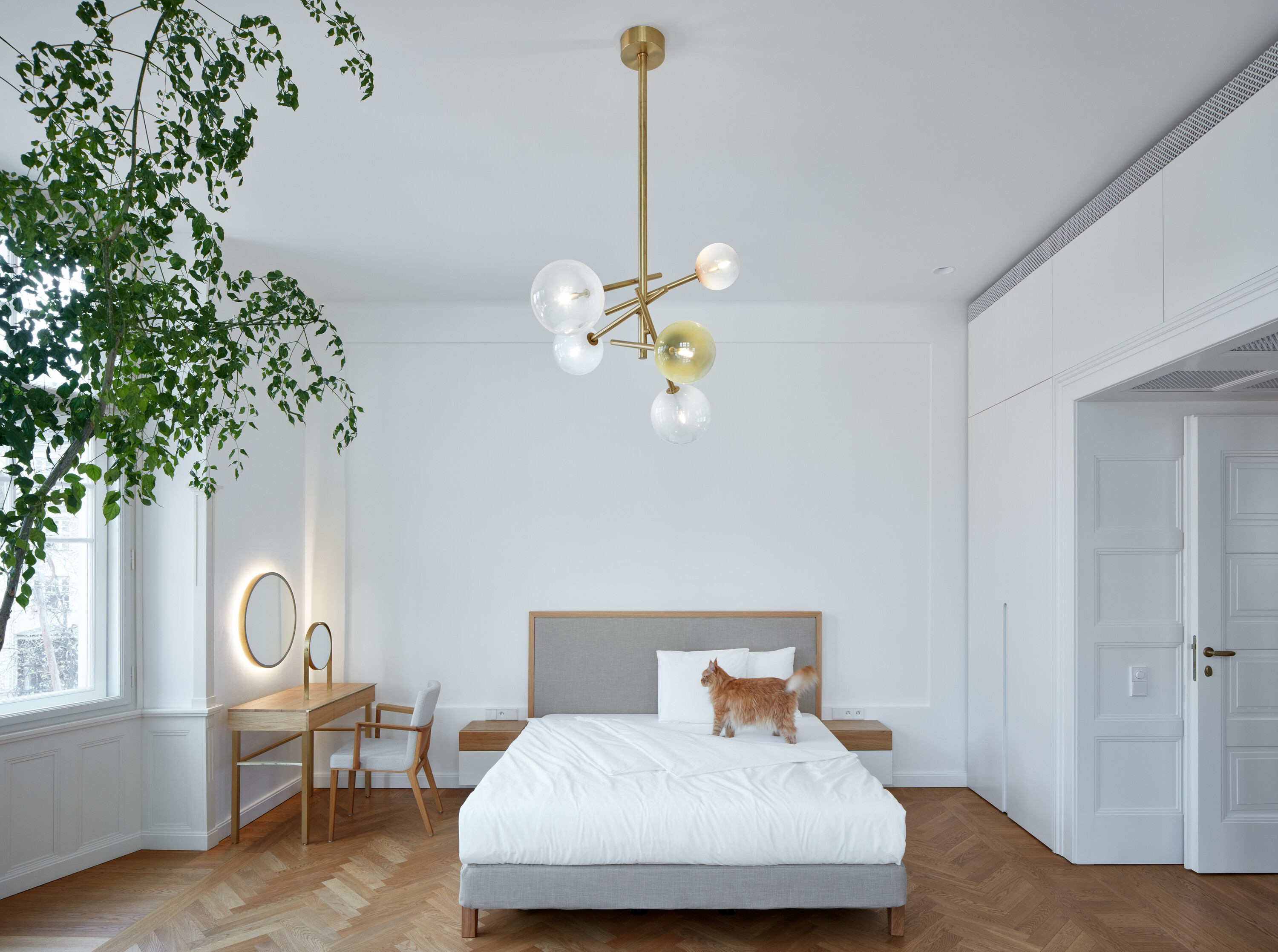 „Dvojité dveře do pokojů jsme narovnali na jednu osu tak, aby vznikla enfiláda čtyř místností. Nová dispozice vytváří vlastní soukromé světy jeho obyvatel v cípech půdorysu a společné prostory jsou srdcem bytu v jeho středu. Takto jsme dosáhli přirozenou a rozumnou hierarchii prostorů,“ popisují architekti. „Do koupelen jsme dokázali dostat přirozené světlo pomocí nadsvětlíků. Nadsvětlík do koupelny rodičů je doplněn o lamely, které zvyšují pocit soukromí.“ Všechny podlahy jsou nové, dubové, klasický parketový stromeček doplňují bordury kolem stěn. Historizující dveře jsou opatřeny novými klikami, které jsou odlity z broušené mosazi. Závěsná svítidla navrhovali na zakázku DECHEM studio. Pro tento projekt vzniklo svítidlo Kono, které získalo ocenění za nejlepší kolekci svítidel na Designbloku 2019.