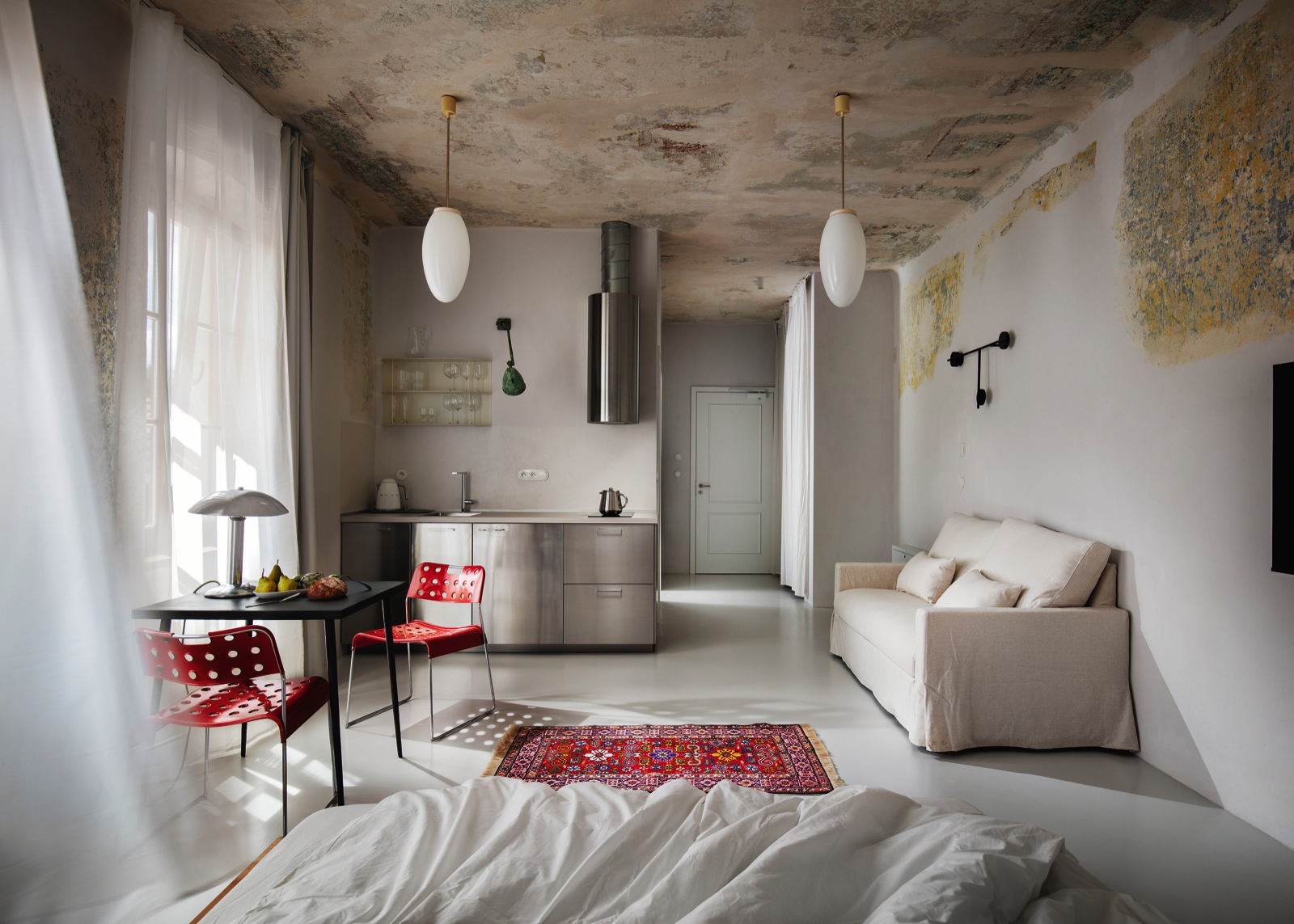 Atmosféru v domě ještě zesiluje umělecký duch Egona Schieleho, jehož ateliér se nachází v těsné blízkosti domu. „Od Casarosa vede přímá cesta Růžovou zahradou k jeho zahradnímu domu, kde je v létě příjemné posezení u řeky. Tam se vždycky ráda zastavím,“ říká Denisa. Zajímavým prvkem interiérů jsou vrstvy původní omítky, které se ukázaly během rekonstrukce a Denisa se je rozhodla někde zachovat, opravit a zafixovat. „Nakonec jsme vycházeli z palety pastelových barev, které nám právě omítky nabídly. Připadalo mi, že tento trochu nedokonalý a hrubší přístup v interiérech Českého Krumlova chybí, a s klientkou jsme se shodly, že právě touto cestou se chceme vydat. Většinu nábytku a svítidel jsem posbírala z různých antiků a bazarů, jídelní židle jsou z Chateau Třebešice. Vintage úlovky doplnily základní kusy sedacího nábytku v neutrálních barvách a kuchyňské linky v nerezi, které prostoru dodávají lesk. Na ně navazují stříbrné a skleněné kousky. A v tomto duchu jsou navrženy všechny apartmány. Vyberte si ten váš na Casarosa.cz a prostě se přijeďte podívat!“ uzavírá Denisa Kubíčková Strmisková.