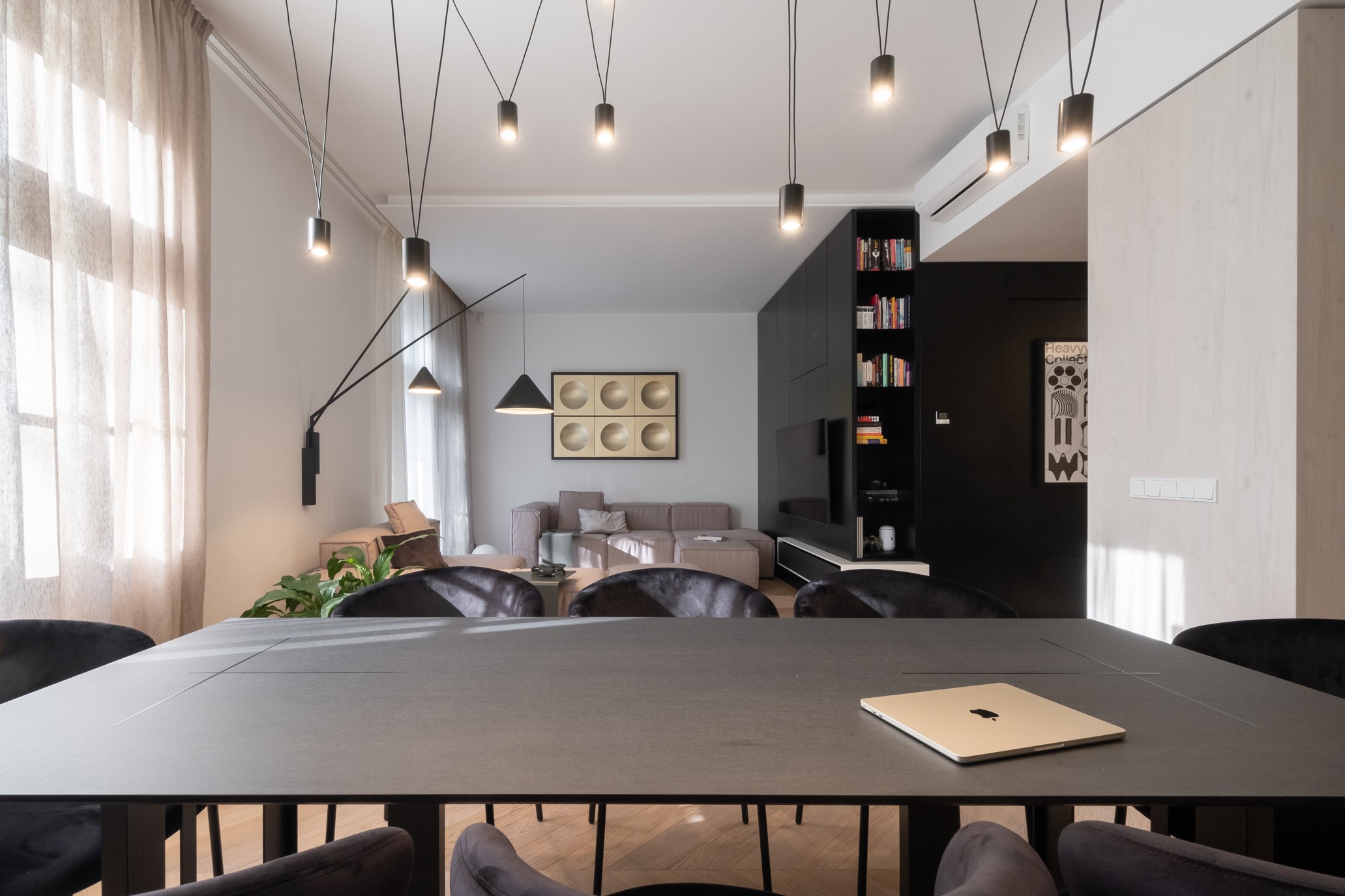 „Rekonstrukcím se v našem studiu věnujeme mnoho let a je to disciplína velmi zajímavá, a to nejen možným výsledkem ale hlavně procesem realizace. Možná rovnováha nového a starého je často vykoupena částečnou improvizací při realizaci a možná překvapení musíte vždy umět řešit rychle a na místě. A možná právě tento druh adrenalinu nás v ateliéru nejvíc baví,“ popisují svou práci architekti Tereza Šimůnková, Alžběta Vrabcová a Lukáš Juřina z DMAE Architects. Tentokrát dostali na starosti starý vinohradský byt. „Naše interiéry vždy odráží v sobě budoucího majitele, přes to mají jistou linku nebo řekněme rukopis, ale každý interiér je svébytný a právě velmi osobní. Tak tomu bylo i při navrhování tohoto rozlehlého bytu ve druhém patře rezidenčního projektu na Vinohradech. Podlahová plocha 190 m2 nám umožnila zvolit koncept dispozice dle našich představ. Vznikl tak návrh na střed bytu jako černého srdce, jádra, bloku, který bude obsahovat a zároveň schovávat vše potřebné. Bude takovou vodící dominantní linkou a to nejen v půdoryse ale i v konceptu materiálů. Díky tomu se vše ostatní dispozičně uvolnilo a dalo více prostoru pro světlo a čisté linie.“