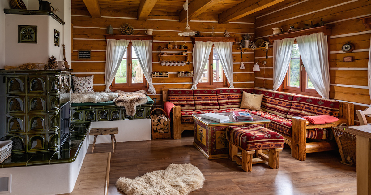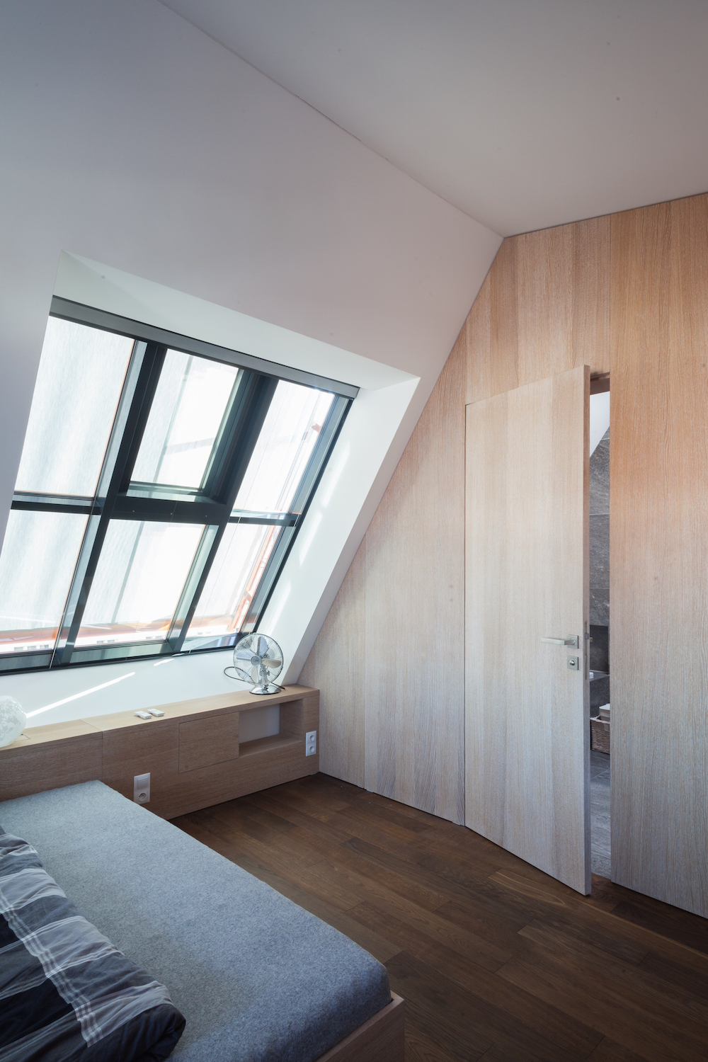 V interiéru najdeme hned několik výrazný prvků, které kontrastují s těmi světlými a nenápadnými. Ve spodním podlaží najdeme světlou dlažbu. Ze světlé dýhy je vyrobená také kuchyňská linka s pracovními deskami z tvrzeného umělého kamene. Vše je vyrobené na míru, a proto je prostor využitý na maximum. Na kuchyň navazuje praktická nika s knihovnou a jídelní stůl, který byl také vyrobený na míru. Výrazným estetickým prvkem je schodiště z tmavého dřeva, kolem které je na zdi použitá moderní betonová stěrka. Konec schodiště osvětluje denním světlem malý světlík. V patře je pak malé pódium, do kterého je zasazena postel. Za dveřmi, které jsou součástí dřevěné stěny, je koupelna s tmavým kamenným obkladem a dalším světlíkem.