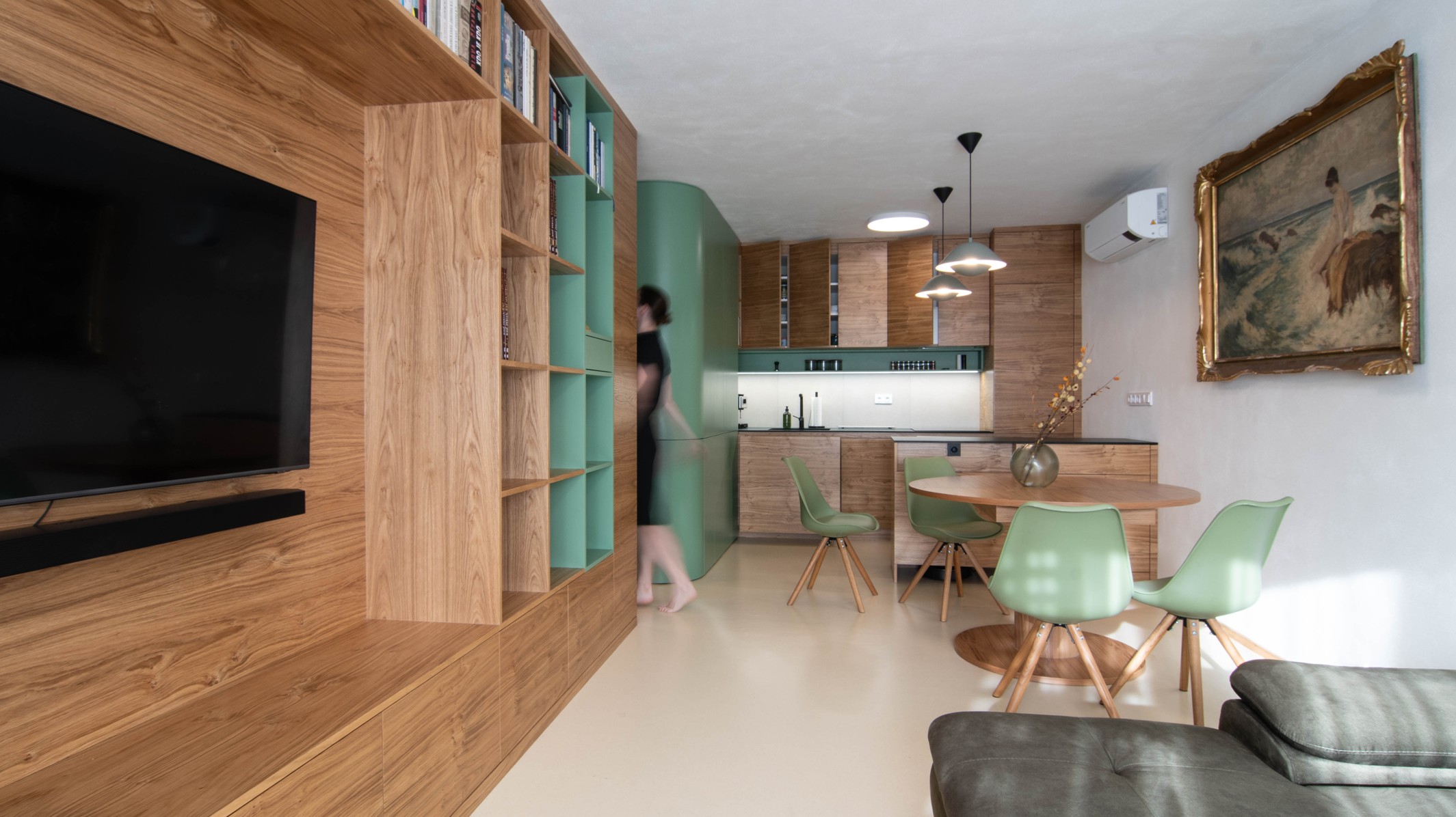 Centrální část bytu – hygienické jádro a kuchyně – je obalena do měkkého, zaobleného objemu v zeleném obkladu, který se stal hlavním vizuálním motivem interiéru. Do tohoto tvaru jsou integrovány dveře i úložné prostory na boty, pračku či potraviny, stejně jako pohovka v pracovně. Druhým klíčovým materiálem je tmavá dubová dýha, která spolu se světlou kaučukovou podlahou vytváří vyvážený základ pro další prvky. Vstup do ložnice je skrytý v obkladu, ze strany ložnice se otevírá pohled na čistou sestavu skříní bez patrných dveří. Všechny čalouněné části včetně polštářů sjednocuje zelený potah. Pokoj pro čtyři sourozence nabízí palandy částečně oddělené přepážkami s kruhovými otvory, které vytvářejí alespoň náznak soukromí. Každé lůžko má vlastní poličku a je kryto knihovnou či šatní skříní, aby vznikly intimní „pelíšky“. V koupelně se podle přání investorů nachází také vestavěná sauna, přičemž materiály i barevnost navazují na zbytek bytu a opakují se na neutrálním podkladu velkoformátových keramických obkladů. Výsledkem je kompaktní, hravý a zároveň kultivovaný interiér, který dokazuje, že i panelový byt může mít výraznou architektonickou identitu.