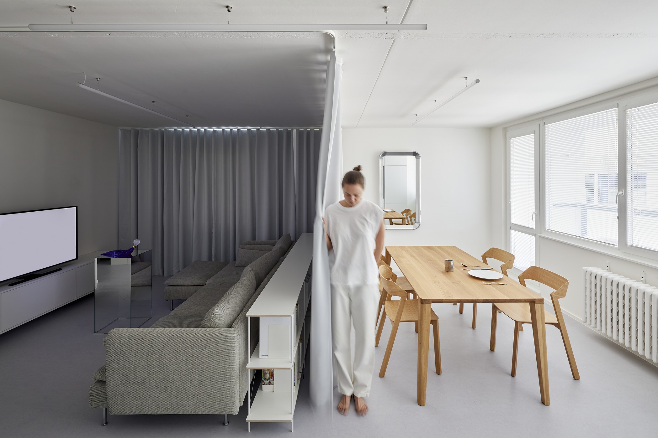 Pro majitelku bylo důležité, aby synové měli své vlastní pokoje. Jsou symetricky identické. Každá má stůl přes celou šířku pokoje, zabudovanou skříň a výsuvnou postel. Tu lze používat jako klasické jednolůžko, sedačku, nebo při vysunutí jako skromnější dvoulůžko. Když je potřeba se celé dny učit, dívat seriály, nebo se válet, lze ji snadno přemístit do středu místnosti. Nastavitelná nástěnná lampa dobře slouží při jakékoliv poloze postele. Když je třeba na chvíli trochu více prostoru, například na cvičení, lze celou postel přesunout pod stůl, který nemá žádné podnože a je kotven na ocelových konzolách ze stěny. Skrze světlíky nad skříněmi se sluneční světlo dostává skrz pokoje do vstupní haly a koupelny. Sluneční světlo v těchto prostorách je v panelácích vzácností. Tok světla opačným směrem má však obyvatel pokoje pod kontrolou vlastním ovládáním zatemňovací rolety nad světlíkem. Přes celý byt, od podlahy až po strop, běží jednotná lineární sestava bílého utilitárního nábytku. Integruje v sobě kuchyni, mnoho skladovacího prostoru, prostor pro pračku a sušičku i samostatnou toaletu. „Strohost, která provází celý projekt a je panelovému domu vlastní, se projevila i v řešení zabudovaného nábytku. Veškerý zabudovaný nábytek i povrchy, kromě závěsů a podlahy z marmolea, jsou bílé. Spolu vytvářejí pozadí umožňující svobodný výběr volně stojícího nábytku, doplňků a pokojových rostlin. Dřevo, které je příjemné na dotek, je použito na jídelním stole a pracovních stolech v pokojích chlapců. V bytě ovšem hraje důležitou roli i modrá barva. Tu má paní H ráda. Je všude a současně nikde. Je skrytá a objeví se vždy, když se cokoli otevře. Je uvnitř každé skříně, kuchyňské skříňky, WC nebo v koupelně. Modrá je ornament, který se rozvíjí různorodostí vybavení, které uvnitř nábytku rodina uskladní. Druhá vrstva ornamentu je méně nápadná, ale dá se najít. Jsou jím styky panelů a ošetřené „jizvy“ po odstranění příček. Podobně jako původní stále dobře fungující článkové radiátory nebo trubkové rozvody vytápění, společně představují paměť a charakter původního panelového bytu. Tyto momenty a prvky se nesnažíme skrýt jakoby byly něco nehezkého. Panelový byt se za ně nemá proč stydět. Jsou pro něj přirozené,“ uzavírají architekti.