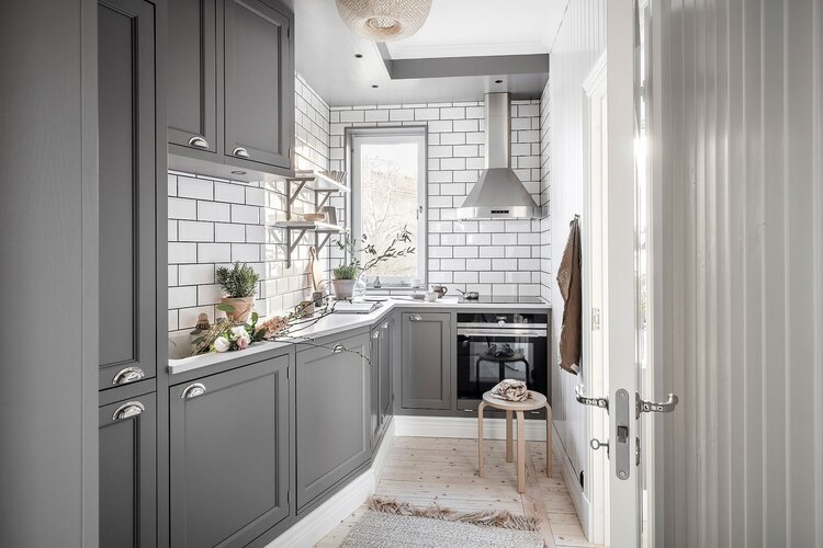 U barev se ještě na chvilku zastavme, protože právě na nich je jedinečná atmosféra tohoto malého bytu založená. Když do bytu vejdete, přivítá vás útulná hala obložená bíle lakovanými palubkami, se světlou dřevěnou podlahou. Odtud vedou dveře do koupelny, ve které najdeme pro tento interiér tolik typické dřevěné skříňky, tentokrát v zeleném odstínu. V jedné ze skříněk je dokonce schovaná pračka. Když se vydáte nalevo, vejdete do prostorného obývacího pokoje, na jehož konci je vchod na balkón. Světlý prostor je zařízený jednoduše, přesto rafinovaně. Nízké skříňky po celé jedné stěně v šedém tónu nabízí velkorysý úložný prostor, přesto neubírají místnosti na její vzdušnosti a odlehčenosti. Je tu pohodlné posezení a také jídelní stůl. Na opačné straně bytu je úzká kuchyň, ve které bylo místo využité do posledního centimetru. Šedé skříňky s lesklými kovovými detaily dodávají kuchyni punc luxusu. Z kuchyně vedou dveře do ložnice. Také v ložnici najdeme na míru vyrobený nábytek. Je to veliká šatní skříň sahající až ke stropu a na protější straně pracovní stůl. Oba kusy nábytku jsou ve světlejším šedém tónu, než sousedící kuchyňská linka a potravinové skříně. Chytrý design v tomto malém bytě obstál na jedničku.