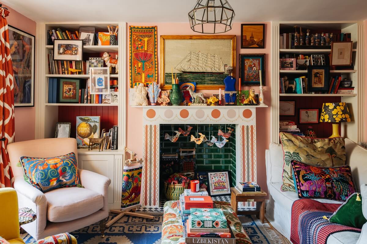Kromě výrazných kusů nábytku se veselé barvy objevují také na textiliích. Na podlaze je modrý koberec, na oknech jsou červené závěsy, to vše doplňují polštáře s excentrickými vzory. Obývací pokoj je sice malý, ale otevřením harmonikových dveří do chodby se alespoň opticky zvětší. Ani předsíň není fádní, jak obvykle bývá. Její stěny totiž zdobí "Willow Boughs" od Williama Morrise. Odtud se dostanete do kuchyně, jejíž skříňky jsou natřené barvou "India Yellow" od Farrow & Ball, která skvěle ladí s dubovou pracovní deskou. Z kuchyně lze také vstoupit na soukromou venkovní terasu. Kuchyně má pouze 11 metrů čtverečních, přesto se sem vešel jídelní stůl. Použitím lavic místo židlí majitelé ušetřili spousta místa. Pokud máte v bytě málo místa, musíte být kreativní. Nad jídelní stůl majitelé přidali sušák, který lze stáhnout/vyzdvihnout podle toho, jak se zrovna používá. A až ke stropu byla nainstalována police pro větší úložný prostor. Do hlavní ložnice se vchází přes kuchyň. Stěny jsou vymalovány barvou "Lulworth Blue" od Farrow & Ball. Interiér tohoto bytu je důkazem, že se nemusíte bát ani divočejších kombinací barev a vzorů.