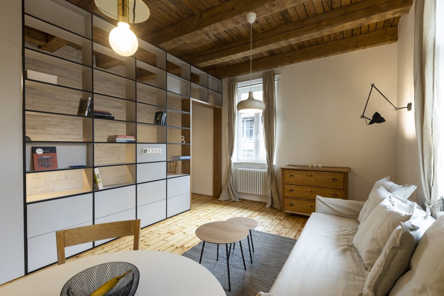 Jednopokojový byt neprošel dispozičními změnami, největší stavební úpravou bylo odhalení zmíněného stropu, který prostor krásně provzdušnil a dodal mu dobovou atmosféru. „Při malometrážních bytech je velmi důležité vytvořit jasné funkční zóny. Prostorný pokoj nám umožnil navrhnout zdravou spací část, která je oddělena od denní části knihovnou, je prosvětlená a větraná. Knihovna se v rohu mění na vestavěný šatník, který vytváří dostatek úložného prostoru,“ vyvětluje Ing. arch. Jana Tartaľová. V pokoji kromě repasované sedačky, komody zůstalo místo na jídelní stůl. Dostatek úložného prostoru na boty a věšení šatstva se podařilo vytvořit i ve vstupní části bytu. Celá tato část při vstupu je úzká, a aby nepůsobila jako tunel, opticky ji rozšiřují zrcadla na dveřích skříněk. V chodbové části je zabudován i kotel a pračka. V minimalistické kuchyni jsou použité původní spodní skříňky, které byly doplněny kovovými policemi. Kuchyňský kout od vstupní chodby odděluje panel s lamelovou výplní. Koupelna se sprchovým koutem a WC je malá, vybourání okenního otvoru do větrací šachty však zajistilo její přímé větrání. Na stěnách byl použit keramický obklad s terrazzo vzorem.