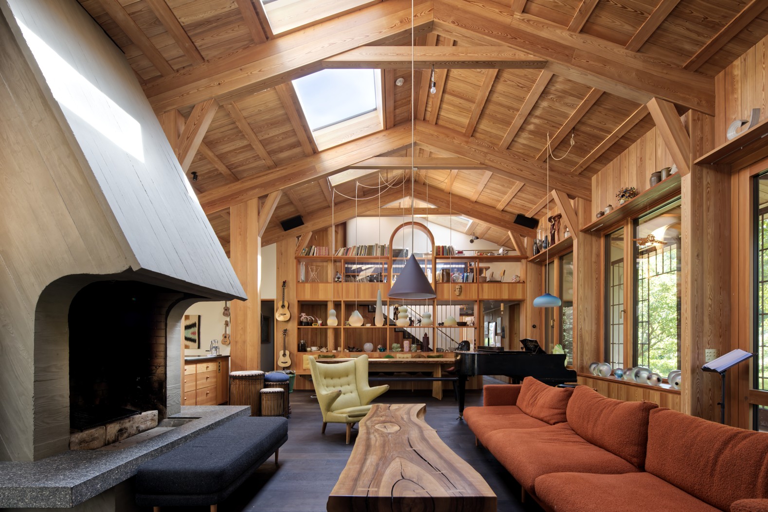 Součástí návrhu je nově přidaná venkovní „pavlač“, která propojuje obytný prostor se spodní zahradou a nově vzniklou terasou v úrovni patra. Vedle ateliéru vznikla kajuta pro hosta a nové schodiště uprostřed dispozice propojuje prostor s menším novým ateliérem v podkroví. Naopak směrem dolů v úrovni severní zahrady, byl dům značně přestavěn s cílem, nabídnout zde individuální pokoje dětí a ložnici rodičů, včetně hygienického a potřebného technického a servisního zázemí. Kabinet kuriosit, dělící obytný prostor od schodiště vrhá roztodivné stíny na protější stěnu.