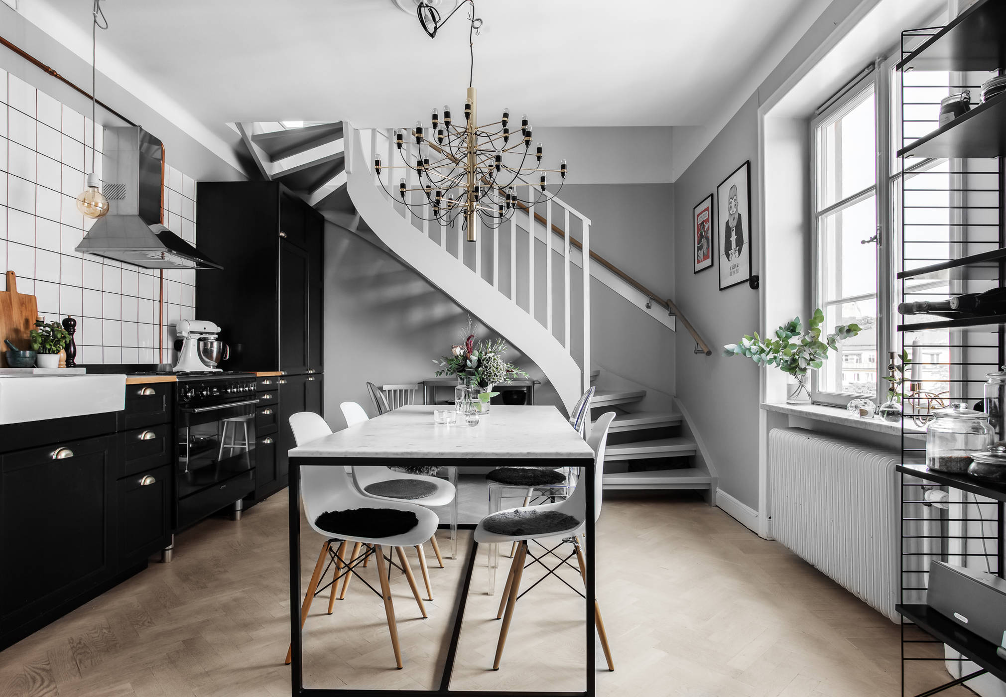 Tak jak tomu často bývá, i v tomto bytě je jeho srdcem kuchyně. Jedná se o velkorysý prostor zařízený v moderním skandinávském stylu. Kraluje tu černá barva, kombinovaná s bílou a dřevěnými detaily. Mosazné kování dodává černé lince luxusní šmrnc. Z kuchyně vede světle šedě natřené schodiště až do podkroví. V přízemí je hlavní ložnice a dětský pokoj. Protože je děťátko zatím malé, rozhodli se všichni spát v přízemí. Časem se bude účel jednotlivých místností ještě měnit. Když vejdeme do podkroví, přivítá nás útulný obývací pokoj, odkud vejdete na terasu. Kromě pracovního koutu je tu ještě jedna soukromá ložnice. Zatím slouží jako pokoj pro hosty, časem bude právě zde dětský pokoj. Díky šikovné přístavbě v nevyužívané půdě, která nebyla finančně příliš náročná, se rodina nemusela z oblíbeného místa stěhovat.