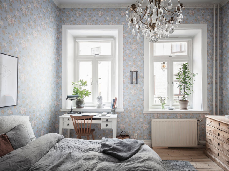 Byt má něco málo přes padesát metrů čtverečních a má klasické dispozice. Vejdete do malé chody, ze které vedou dveře do koupelny, malé komory a nově zrekonstruované kuchyně. Nenechte se zmást. Na podlaze v kuchyni není nová dlažba, ale dřevěná podlaha byla natřena šachovnicovým vzorem. Černobílá kombinace kuchyni sluší. Ačkoli byla linka vyrobená nová na míru, byla zhotovená v klasickém rustikálním stylu. Doplňují ji černé spotřebiče, a především tmavá dřevěná pracovní deska z masivu, která je ve stejném odstínu dřeva jako starožitný ponk. Ten odděluje kuchyňskou část od obývacího pokoje, kde našel místo i jídelní stůl. Z této části je možné vejít také na útulný balkón orientovaný do klidného vnitrobloku. Za dvoukřídlými dveřmi za obývacím pokojem ja romantická ložnice s klasickými švédskými tapetami. Pod oknem je klasický psací stolek a nechybí velké úložné skříně. Díky vhodně zvolenému nábytku je tento byt vzdušný a působí mnohem větším dojmem.