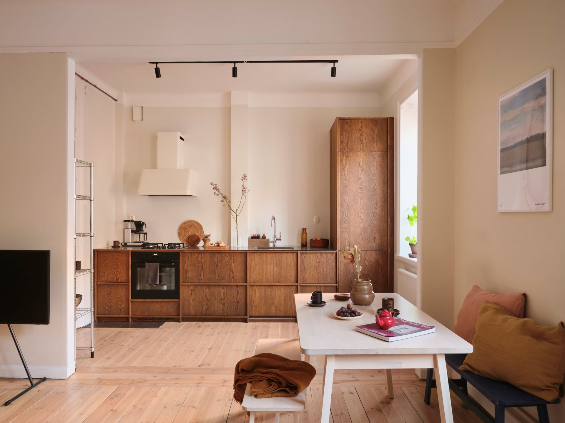 Z oken je vidět na okolní střechy a v podvečer sem dopadá zlatavé světlo západu, které prostoru dodává až malířskou atmosféru. K bytu patří také překvapivě velkorysé sdílené zázemí – místnosti pro tvoření a práci, společenský salon i dvě zahrady ukryté ve vnitrobloku. Jedna bují zelení a nabízí skleník, druhá je komornější, s magnolií, která na jaře promění dvůr v malý přírodní zázrak. Interiér působí díky harmonickému propojení prostoru, světla a materiálů mimořádně klidně a vyrovnaně. Atmosféra se přirozeně zpomaluje – je to typ bydlení, které samo od sebe vybízí k pohodovějšímu životnímu tempu.