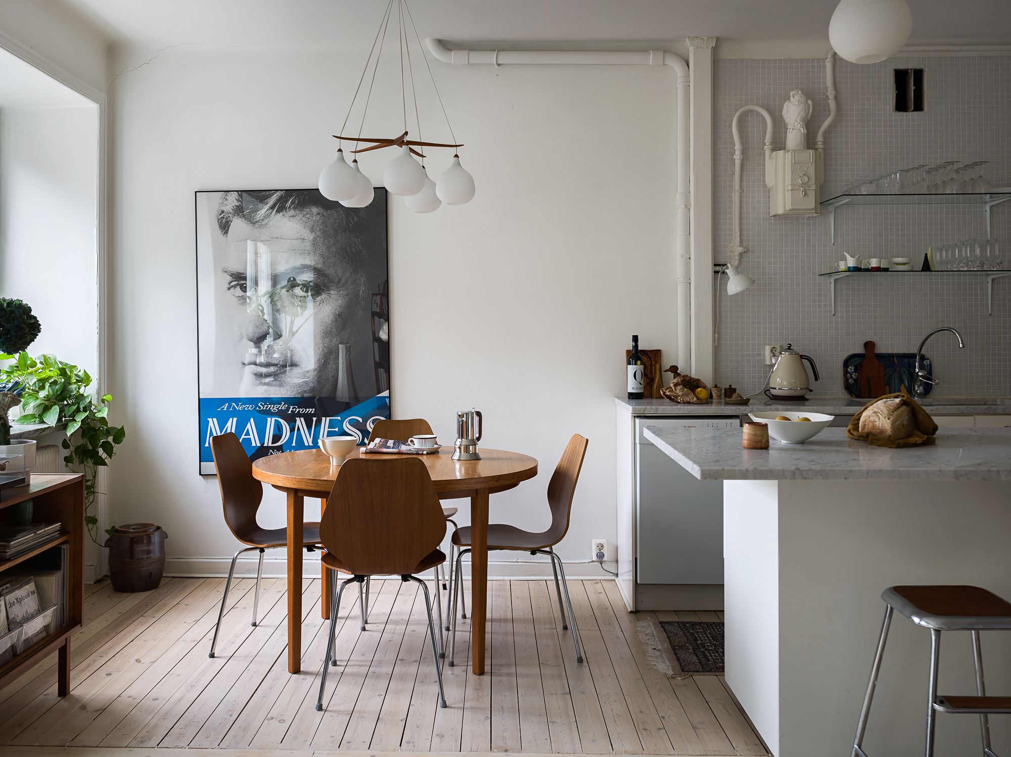 Za vstupními dveřmi je malá chodbička s přilehlou komorou, která slouží jako malá šatna. Pak vejdete do chodby, ze které je možné zabočit napravo do koupelny, do které se pohodlně vešla i prostorná vana. V této části bytu je výklenek s policovým dílem a malá komora. Vpravo je malá místnost zařízená jako ložnice. Kromě postele a knihovny zde nezbylo místo na nic jiného. Aby nebyl tento tmavý prostor zcela ošizený o denní světlo, jsou ve zděné příčce použité luxfery, které potřebné paprsky propouští. Hlavní obytná místnost je koncipovaná jako jeden velký prostor rozdělený na funkční zóny. Kuchyňský kout je proto zařízený pouze nízkými skříňkami v nenápadném bílém dekoru s luxusní mramorovou pracovní deskou. Od obývací části je kuchyň oddělená praktickým ostrůvkem s barovými židlemi. Jídelní stůl je z masivního dřeva v tmavém dekoru, podobně jako ostatní nábytek. Je zvolený v retro stylu 60. let, a tak skvěle doplňuje všudypřítomné vinyly. Tmavý nábytek nijak neubírá na vzdušnosti interiéru díky parketám, které byly bíle nalakované.