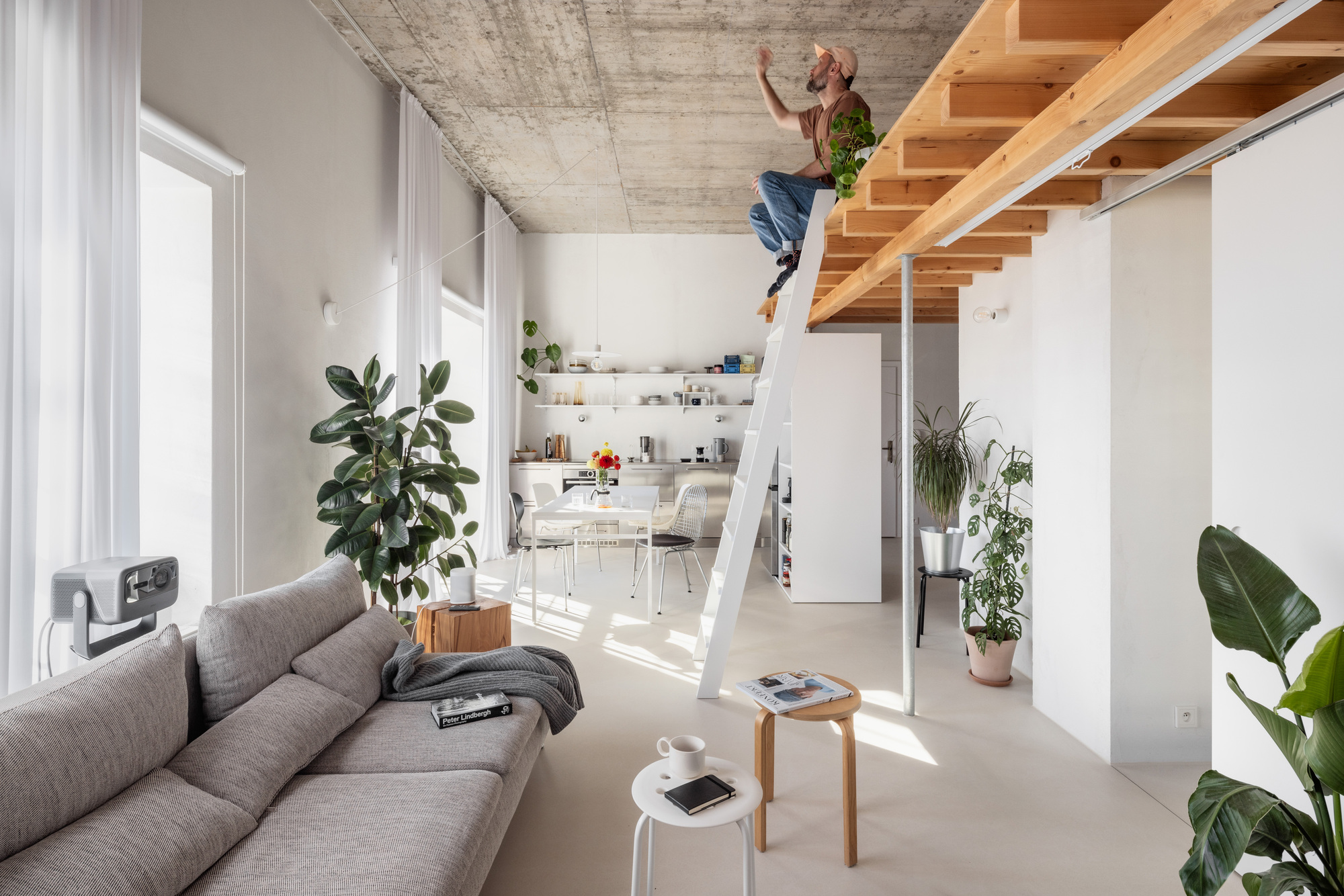 Klíčovým prvkem projektu bylo přidání druhé úrovně - mezaninu, který rozšířil obytnou plochu o více než 17 m². Mezanin nejenže prostor ozvláštňuje, ale také umožňuje střídání intimních zákoutí a otevřených ploch v jednom celku. Architekti vědomě pracují s proporcemi, rozmazávají hranice mezi funkcemi jednotlivých místností a vytvářejí interiér, který nelze jednoznačně zařadit. Materiály jako dřevo a textil v kombinaci se světlem z různých světových stran vytvářejí prostředí, které dýchá - stejně jako lidé, kteří ho obývají. Výsledek? Byt, který je nejen estetický, ale především živý a přizpůsobivý.