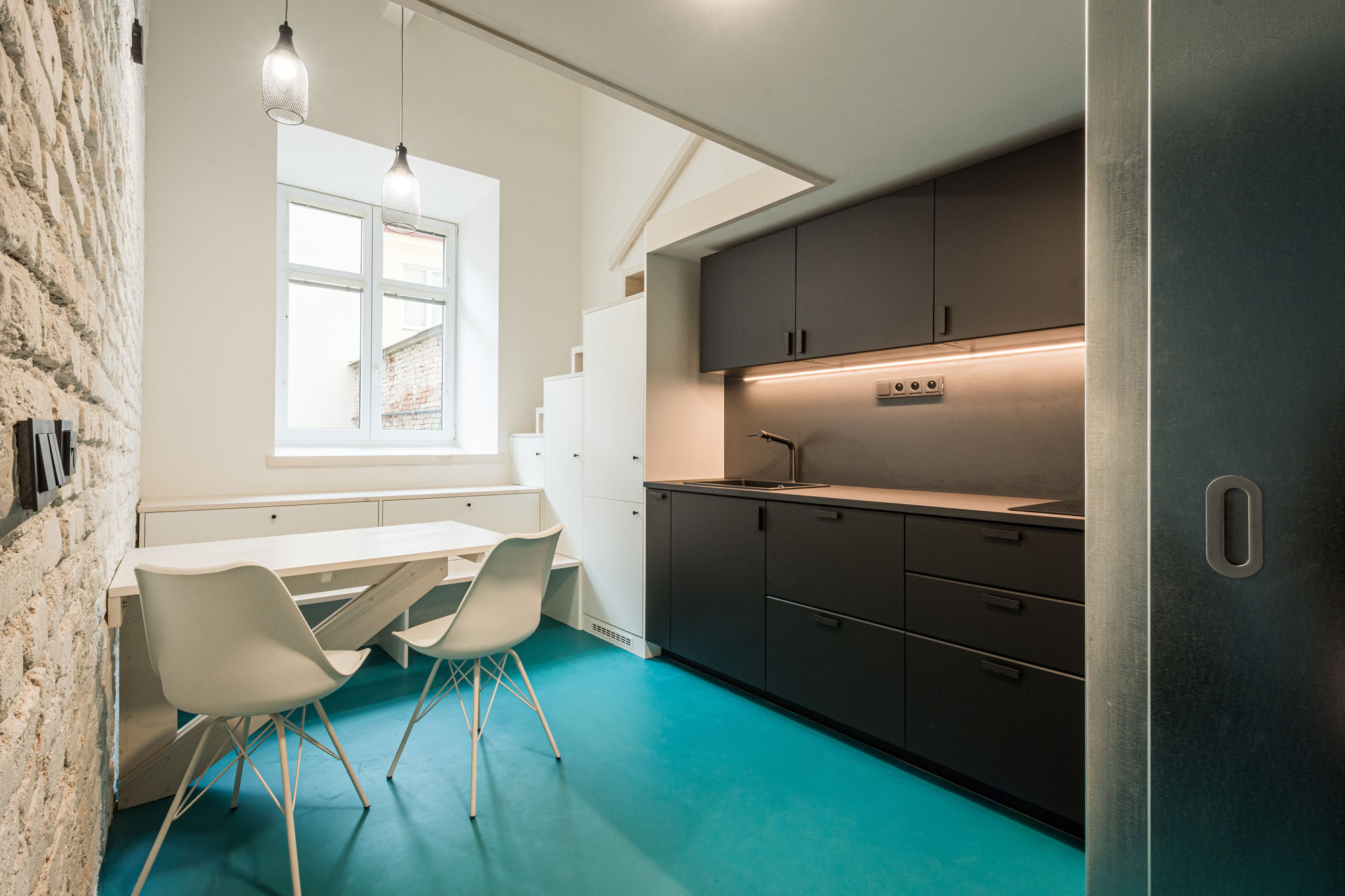 Návrh celkové rekonstrukce prostor spočíval v dispoziční úpravě a maximální využití dané světlé výšky vnitřních prostor, která přesahovala výšku 4,1 m. Přetvořením koupelny a kuchyně byt získal lepší a logičtější řešení. Vložením nových dřevěných pobytových pater, se získalo více pobytové plochy bytu, cca o 14 m2. Přetvořením koupelny a kuchyně byt získal lepší a logičtější řešení, a to i za pomocí sedacího vestavěného nábytku s úložnými prostory, které mají i funkci schodiště do vestavěných pater. „Nejlepší mi přišel moment, kdy uprostřed hotového bytu stál stavbyvedoucí, zasněně se rozhlížel a řekl: Já se vám přiznám, že jsem si na začátku fakt nedokázal představit, že by to tu mohlo vypadat takhle.“ Pochvaluje si rekonstrukci majitel bytu. „Michal a jeho tým dokázali skvěle navnímat prostor – původně vybydlenou stísněnou ruinu, jejíž nákup se mi moje okolí snažilo rozmluvit. Teď je z ní světlý, vzdušný, vtipný a praktický byt, domyšlený do nejmenšího detailu.”