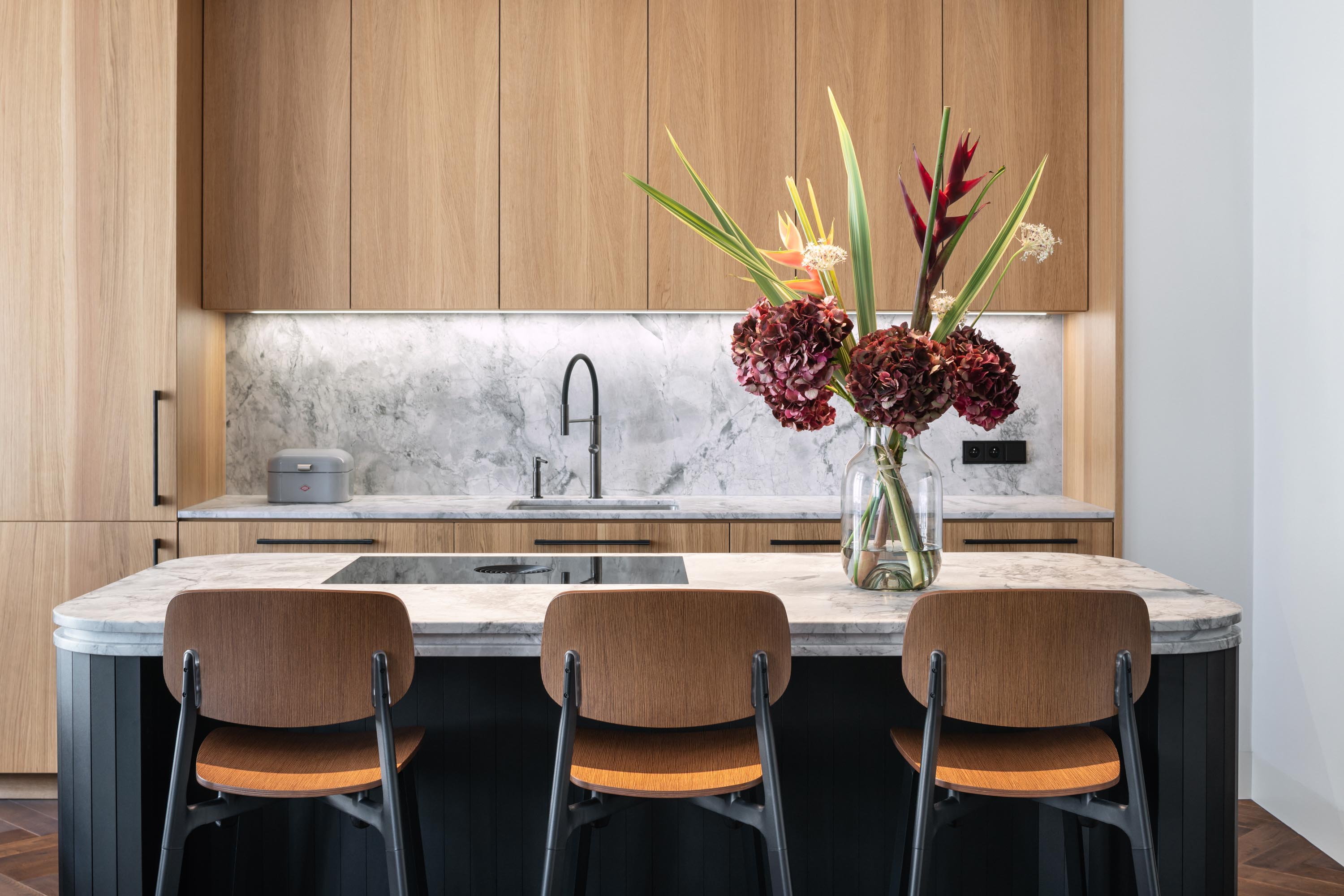 Nová realizace ateliéru arkhe ukazuje, co dokáže chytrá změna dispozic a pečlivá selekce materiálů. „Moderní zásahy jsme přiznali a zkombinovali je s původními prvky a odkazem vinohradských bytů,“ popisuje Ján Antal, architekt a spoluzakladatel studií arkhe a Perspektiv. Celý interiér vznikal na míru a bez kompromisů – arkhe totiž spojuje architektonické a realizační studio v jednom. Pracovalo se rovněž s kvalitními materiály – od masivního dřeva na podlahách, důsledně vybrané skladby dýhy až po kámen. Studio si při navrhování zakládá na tom, aby prostor nejen dobře vypadal, ale také výborně sloužil, a to i za desítky let. Autoři projektu si potrpí na propracované detaily a v tomto vinohradském bytě jich je hned několik. Například deska kuchyňského ostrůvku je složena z ustoupených vrstev kamene, čímž dodává na monumentálnosti solitéru. „Kámen slouží jako šperk. V kuchyni se podobná investice určitě vyplatí. Nejen že tak do interiéru dostane punc luxusu a nadčasovosti, ale kámen je navíc trvanlivý materiál,“ říká Antal. V tomto případě designéři volili šedý křemen, který tvoří pěkný vzor a zároveň má nejlepší funkční vlastnosti pro použití v kuchyni. Architekti dbali i na to, aby bylo co nejvíce rušivých prvků skryto. Spotřebiče šikovně ukryli v rámci kuchyňském ostrůvku a vestavěného nábytku. Neviditelné je i topení, schované za světle šedým ratanovým výpletem, na který navazuje design židlí u jídelního stolu. Jedná se o dílo švýcarského architekta Pierra Jeannereta z 50. let, jehož design vznikl pro vládní komplex Chandigarh v Indii. Tato židle v současnosti zažívá renesanci a jen pár exemplářů pochází z původní indické dílny, kde se dodnes ručně vyrábějí.