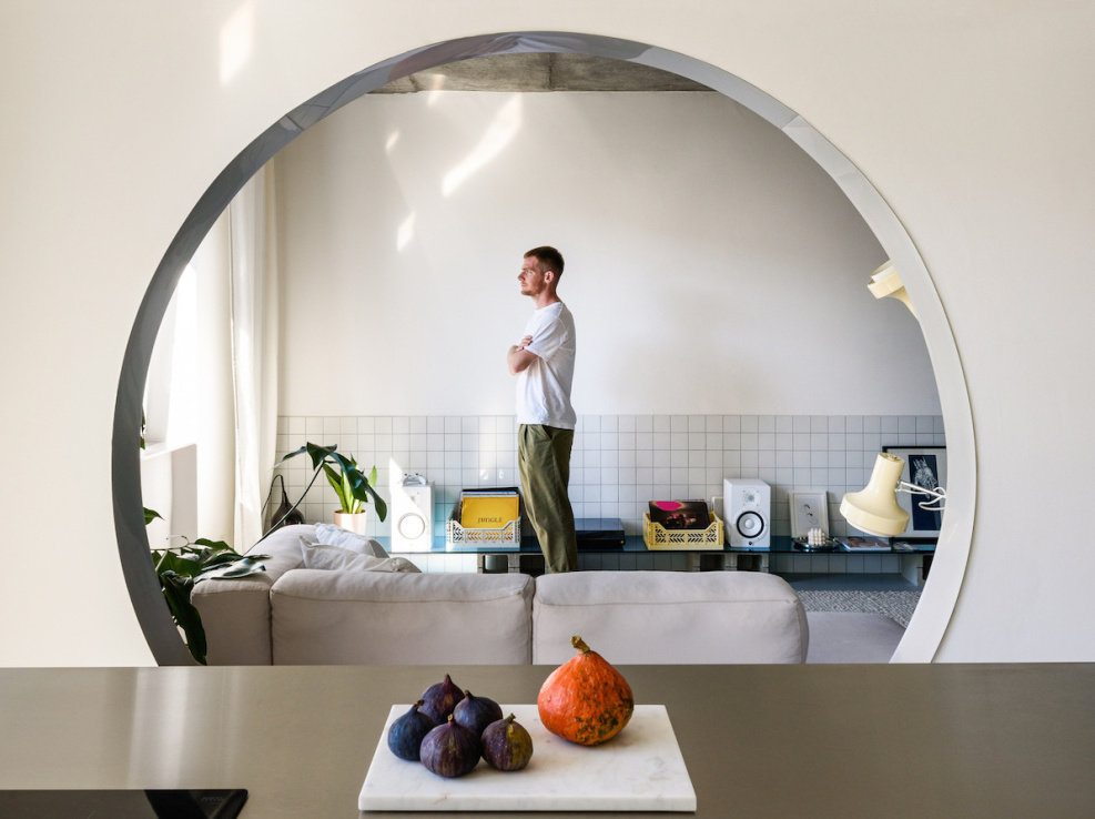 Jediným dělícím prvkem v bytě je dřevěná konstrukce se skleněnou výplní, která nahrazuje původní cihlovou zeď. Požadované intimity v ložnici lze snadno dosáhnout tak, že se v přepážce zavřou dveře a záclony zatáhnou. Přes den se dá naopak prostor otevřít a interiér propojit. Při výběru materiálů měl přednost kov. Nerezová ocel, která je dominantní,, byla použita na parapety, kuchyňský bar a drobnější detaily. Koupelna a toaleta byly ponechané na původním místě. Během rekonstrukce byly použité recyklované přebytečné materiály z jiných projektů. V bytě není vestavěný nábytek, který ještě umocňuje pocit velkého prostoru. U vchodu do ložnice je umístěna otevřená skříň. Interiér je utváří řada drobných detailů, které se spojují v jeden celek. Kombinace západního světla se strukturovaným plechem a s ikonickým kruhovým průhledem vytváří atraktivní každodenní vizuální zážitek.