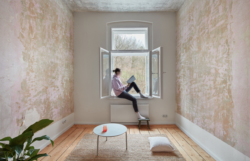 „V obytných místnostech jsme se soustředili na prosvětlení dispozice a otevřenost prostoru. Kuchyňskou linku vsadili do nově vzniklé niky mezi kuchyní a obývacím pokojem, obě místnosti propojuje výdejní okénko, které bylo v takto velkorysých bytech často k vidění. V ložnicích jsme zachovali původní dřevěné podlahy a pouze je repasovali. Koupelně dominuje velkorysý sprchový kout nepravidelného tvaru, umyvadlo a wc,“ vysvětlují architekti. Minimum materiálů a sjednocující design procházejí skrz celý prostor a podporují klidnou atmosféru bytu. Prostupující linkou je odhalená původní výmalba na stropech i stěnách, toto odkrytí vytváří nosné, výrazné a jemně zabarvené obrazy v každé z místností. Byt je v poslední fázi vybaven minimalistickým nábytkem od designového studia Janský & Dunděra a firmy Todus.