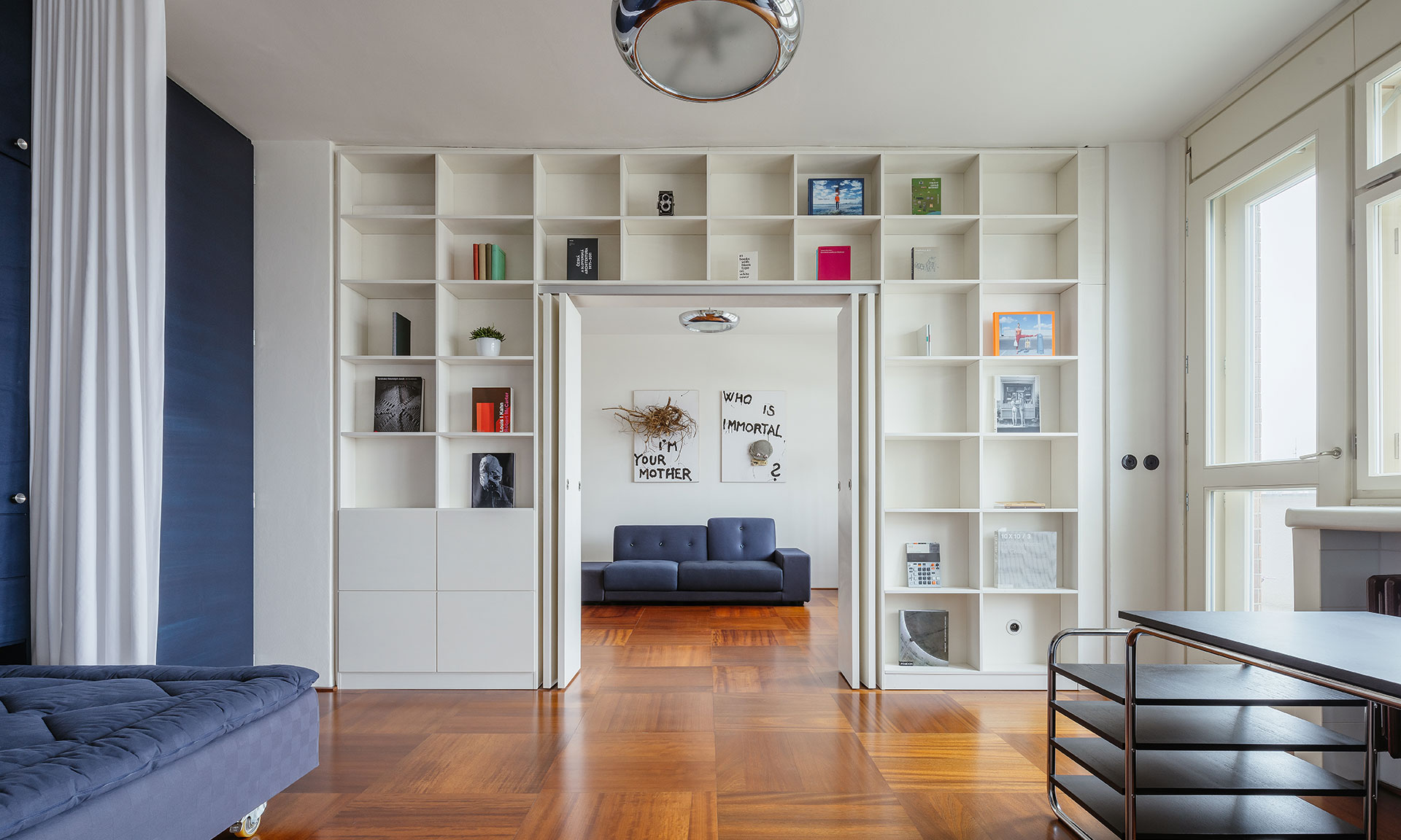 Zásadní změnou byla úprava dispozic. Byt byl rozdělen na společenskou a soukromou část, mezi něž byl vložen kompaktní box s koupelnou. Tento tmavě modrý prvek, obložený dýhou z tropického dřeva, nejen funkčně odděluje prostor, ale zároveň dodává interiéru elegantní kontrast. Původní pokoj služky byl přeměněn na místnost pro domácí práce, zatímco bývalá koupelna nyní slouží jako šatna. Velkou proměnou prošel i obývací pokoj, který se díky flexibilnímu uspořádání může proměnit na pracovnu či ložnici pro hosty. Barevná a materiálová paleta zůstala věrná funkcionalistickým kořenům. Mahagonové podlahy a vínově červené zárubně doplňují bílé vestavěné skříně a kuchyň se světle šedým linoleem. Bakelitové vypínače kontrastují na bílých stěnách a splývají na barevných plochách, čímž podtrhují preciznost návrhu. Atmosféru doplňují původní funkcionalistická svítidla a textilní závěsy, které zlepšují akustiku prostoru. Výsledkem je interiér, který nejen zachovává odkaz prvorepublikového funkcionalismu, ale zároveň vytváří komfortní a nadčasový domov pro jeho současné obyvatele.