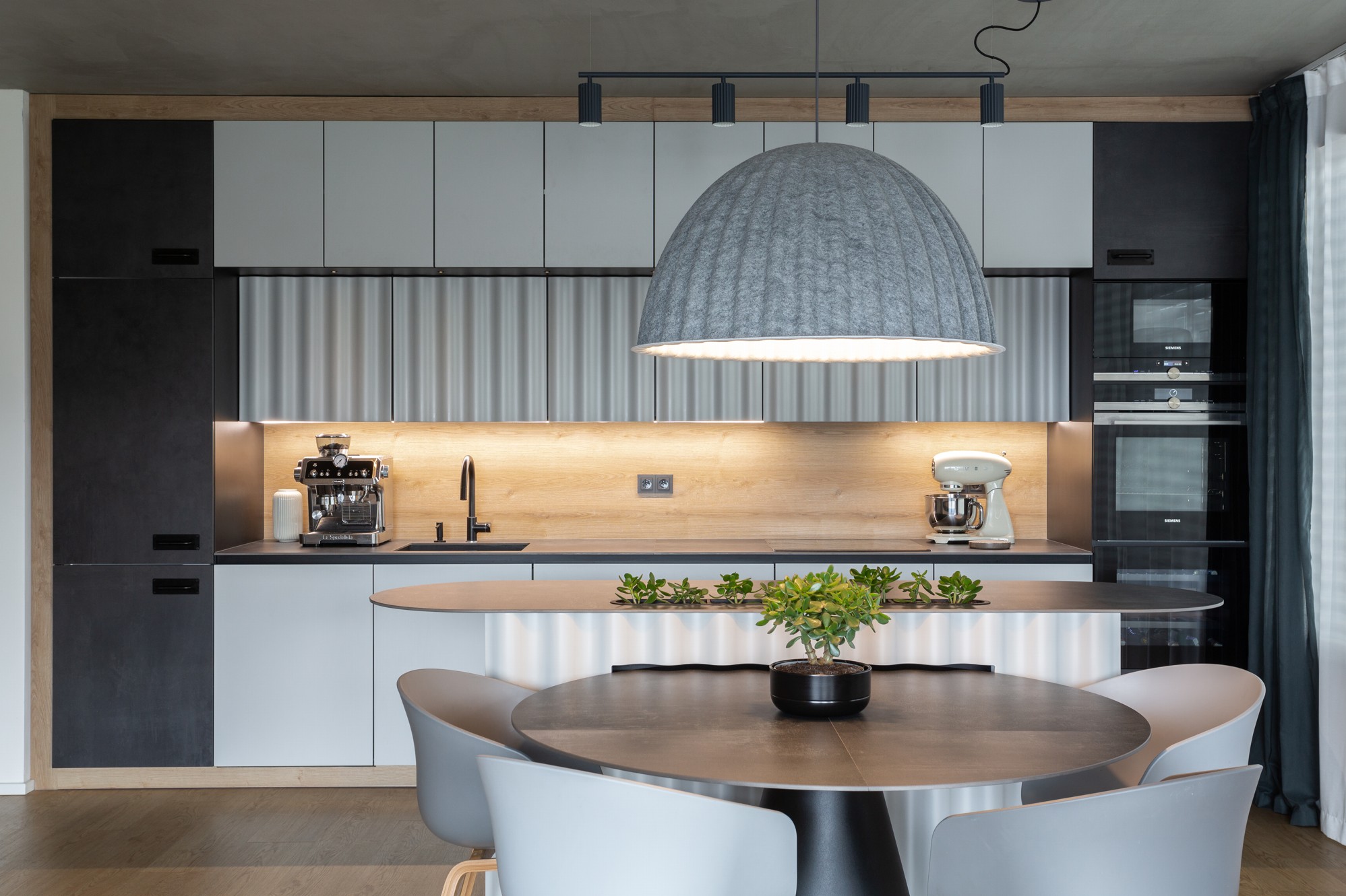 Barevně a materiálově je celý byt laděn jako kontrast měkkých a tvrdších tónů a tvarů. Bílá barva a dřevo versus šedý lak, tmavá keramika, černé doplňky, lepidlem ošetřené stropy a stěna v obývacím pokoji či vstupní hale. Ke zjemnění došlo i použitím motivu vlny na truhlářských konstrukcích. Zde zase vzniká kontrast mezi tvrdou vlnou na knihovně a kuchyni s měkkou na závěsech a záclonách. Vlnka je v obývací části všude přítomná. Objevuje se nejen na dvířkách kuchyně, kuchyňském ostrůvku a knihovně, ale i na světlech. „Dominantou prostoru je veliké plstěné světlo nad jídelním stolem, jehož stínidlo rovněž obsahuje detail vlny. Díky svému materiálu přispívá i ke zlepšení akustiky velkého obývacího pokoje. Další zjemňující prvek je „mini zahrádka“ na bylinky či jiné květiny integrovaná přímo do ostrůvku kuchyně, což bylo i přání paní domu. Návrh ložnice reaguje na kosý tvar domu a opět jako v obývacím pokoji napravuje ne příliš zdatně vyřešenou dispozici. Vymyšleno bylo pódium a postel částečně levitující nad zemí. K odhmotnění konstrukce postele přispívá i podsvícení vykonzolované části. Vyvýšené pódium funguje zároveň i jako noční stolek pro odkládání věcí. Komfortní je zabudovaná indukční nabíječka přímo v truhlářské konstrukci. Polstrování za zády postele netradičně volně přechází i na strop. Vytváří tak spolu s pódiem „box“ na spaní v odstínu šedé barvy. „Vstupní hala používá obdobné výrazové prostředky použité v ostatních místnostech. Dřevo, bílé a šedé truhlářské konstrukce, polstrování identické jako v ložnici, šedé stavební lepidlo místo stěrky a bílá malba. Tím se všechny místnosti logicky propojují v jeden celek. Na konci chodby je vložena zrcadlová skříň, což způsobuje zajímavý nekonečný efekt. Hravost zajišťují jakoby nahodile rozmístěná světla a věšáky, které zároveň na skříních plní úlohu úchytek. Díky výborné spolupráci s investory, kteří se aktivně podíleli na návrhu, vzniklo nejen inspirativní prostředí pro navrhování bytu, ale hlavně příjemné místo pro život,“ dodává architekt.