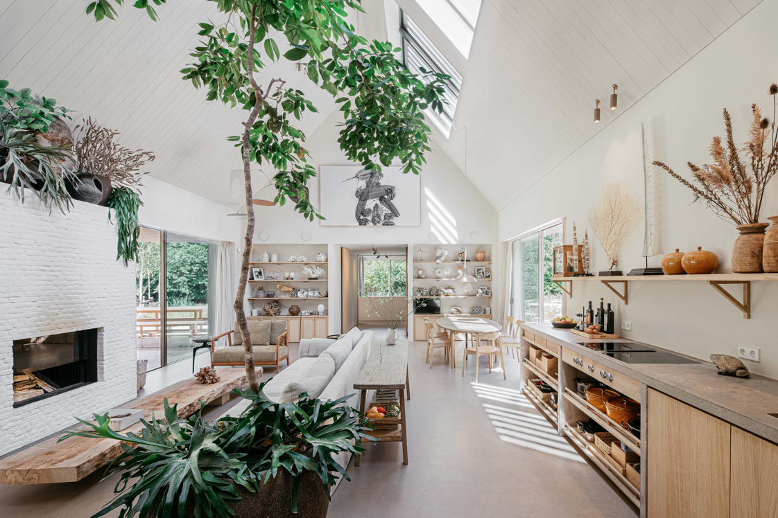 Do centrální místnosti se vejde obývací pokoj, kuchyň, jídelna, ale také vzrostlý strom