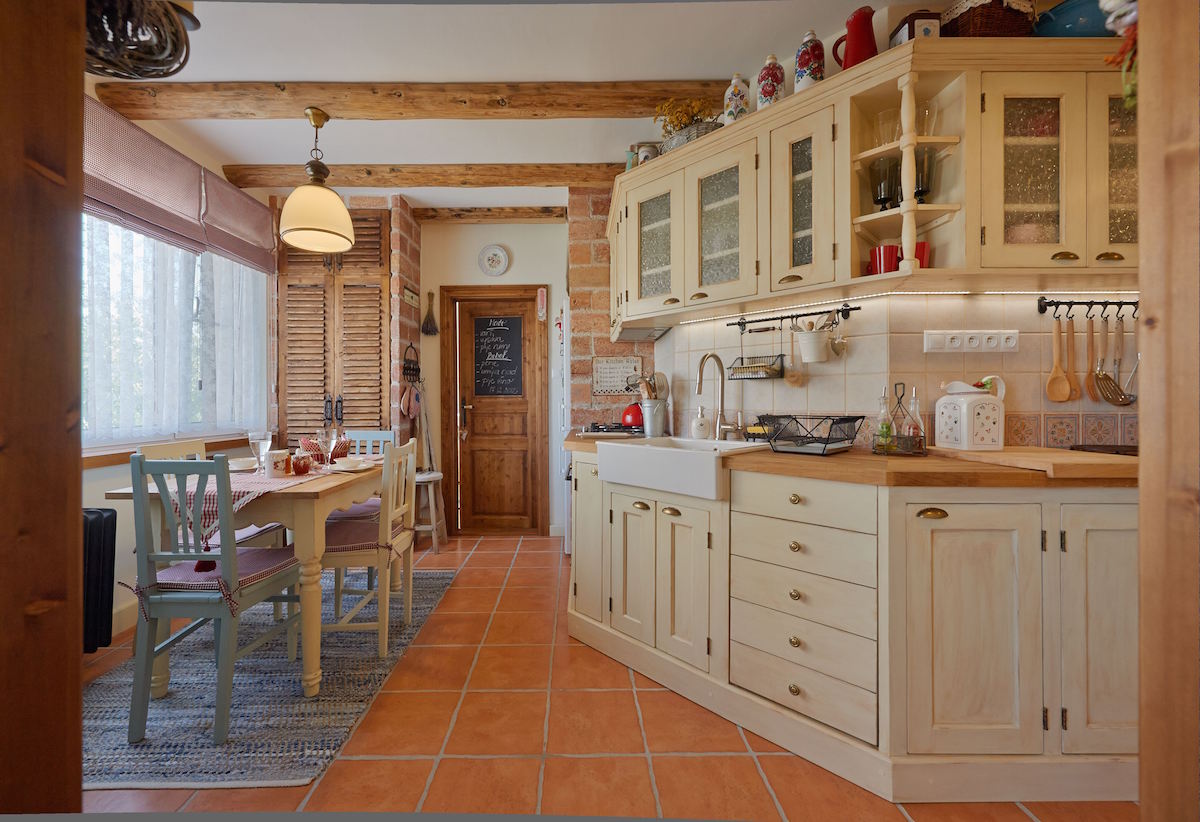 Zcela atypická je v tomto dvoupokojovém bytě kuchyňská linka. Kuchyňský prostor je v centrální části bytu a je spojený s jídelnou. Linka je zalomená, kopíruje stěny a je vyrobená z MDF desek. Ty jsou natřené akrylovou barvou s jemnou patinou. Jídelní stůl byl vyrobený nově na míru, židle pochází se starožitnictví, stejně jako většina dekorací.  Atmosféru venkova pomáhají dotvořit rustikální dekorace, malované nádobí, vhodně vybraná svítidla a romanticky laděné doplňky