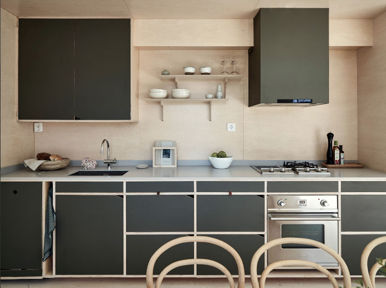 Interiér domu je pro rodinu dokonalý. V přízemí je otevřený prostor s kuchyní, s jídelním stolem, kam se pohodlně vejde až 10 osob a obývací část se sedací soupravou. V teplých měsících jsou neustále otevřená francouzská okna a interiér domu je zcela propojený s exteriérem. Této harmonii pomáhá i všydypřítomné dřevo. Zatímco venku zůstalo bez povrchových úprav, v interéru je borovice bíle naolejovaná. Zdi jsou ve světlém odstínu šedé a béžové a jediným výrazným prvkem je šedozelená kuchyňská linka.